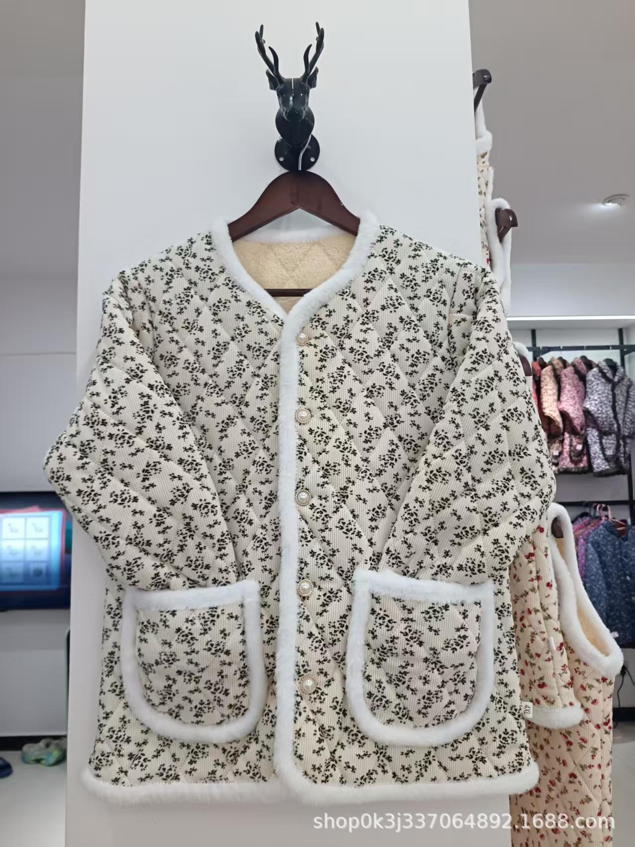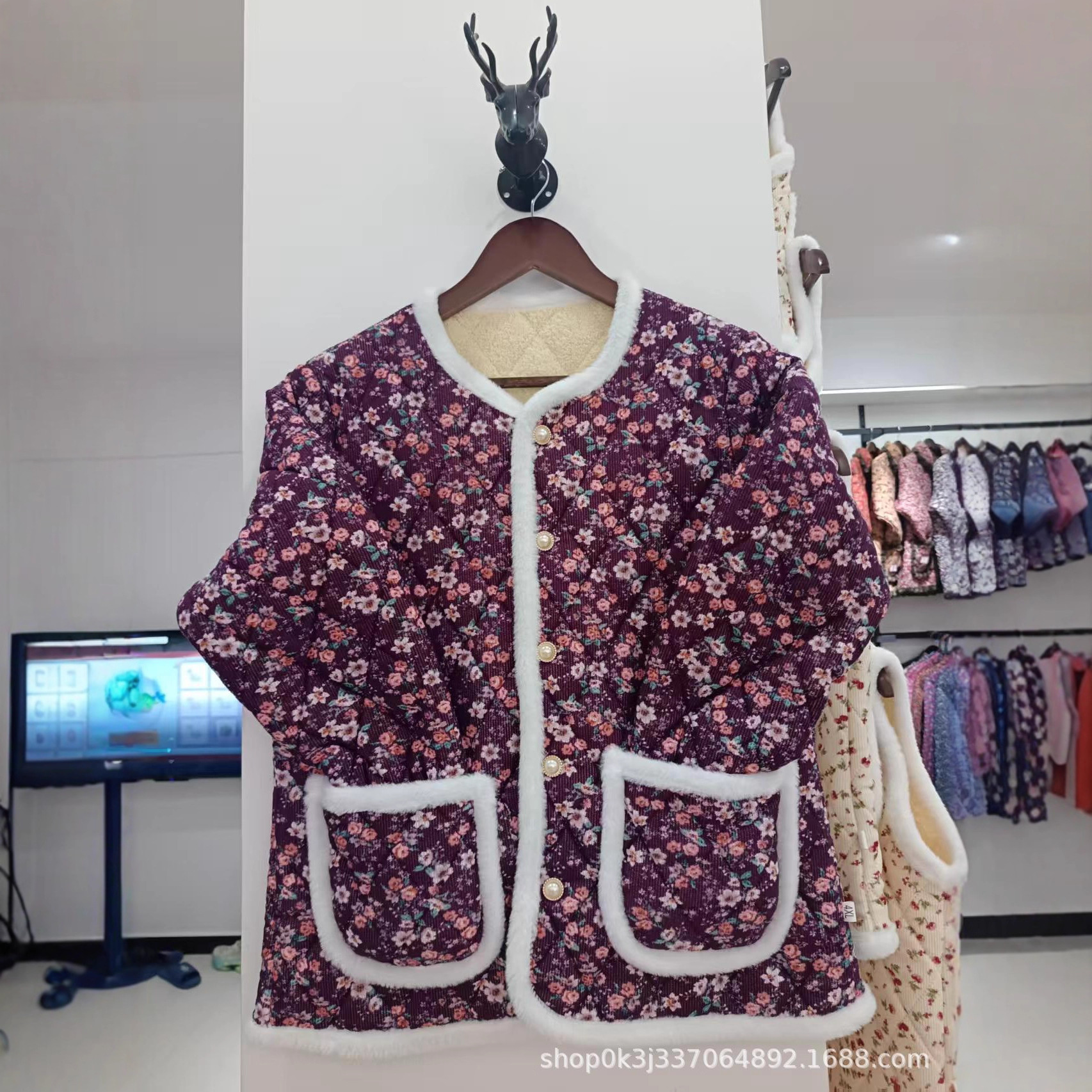 お母さんの綿入れ服、中高年女性用裏起毛綿ジャケット、秋冬用厚手おばあちゃん向け花柄コート、屋台のお母さん向けモデル