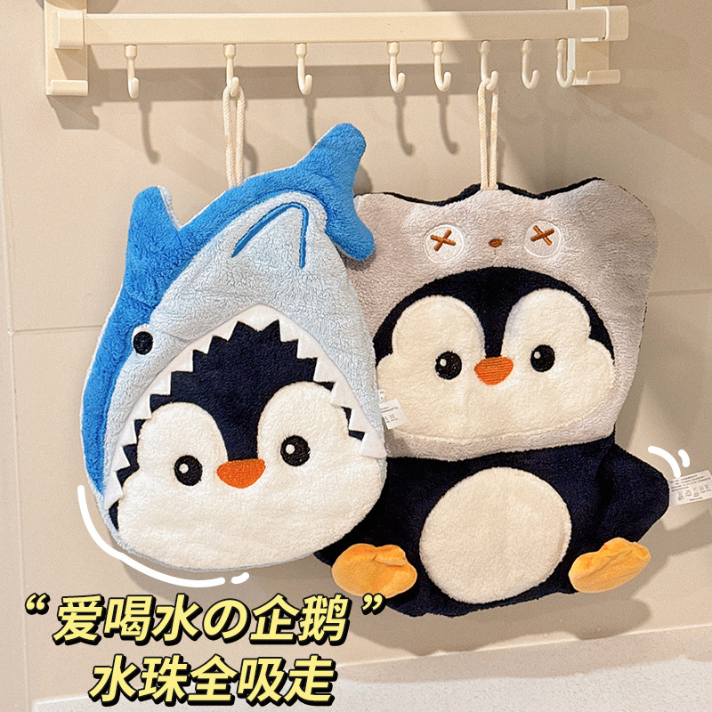 奇思妙想企鹅珊瑚绒擦手巾加大加厚挂式两用毛巾吸水速干不掉毛