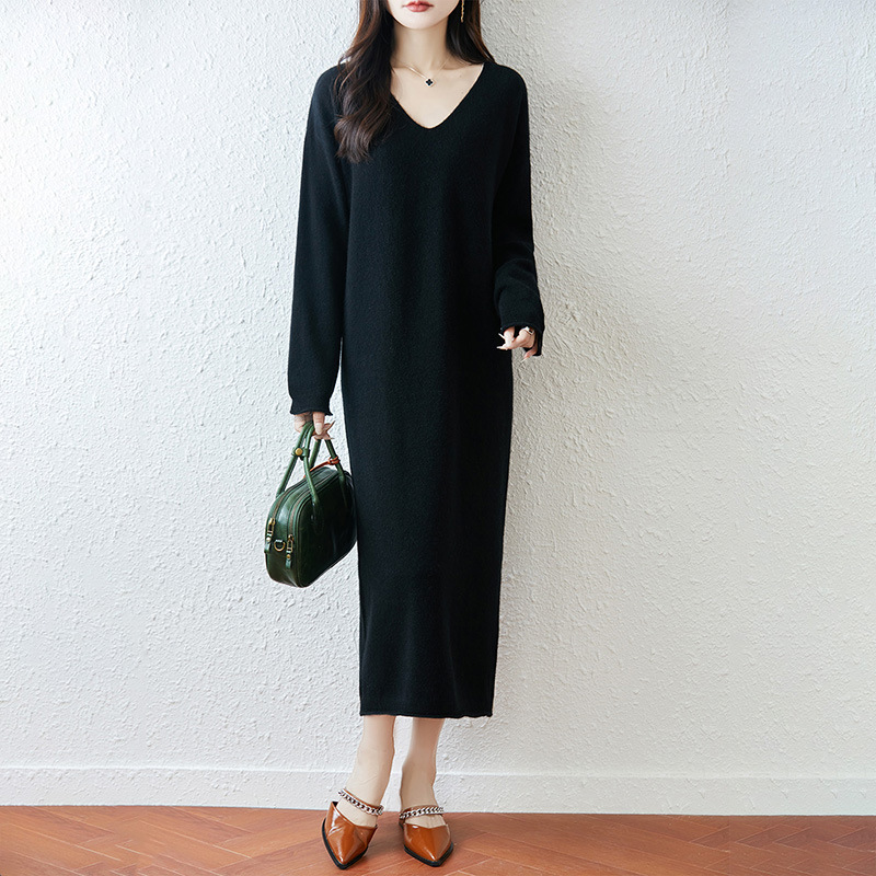 100纯羊毛针织连衣裙女2025新款秋冬V领宽松长款过膝内搭打底长裙