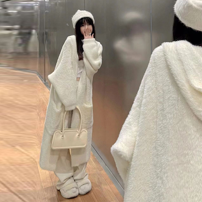 ミンクの毛の帽子のセーターのコートのカーディガンの女性の秋冬の新型のゆったりしていて怠惰な風は厚い長いタイプのニットのコートの厚いです。