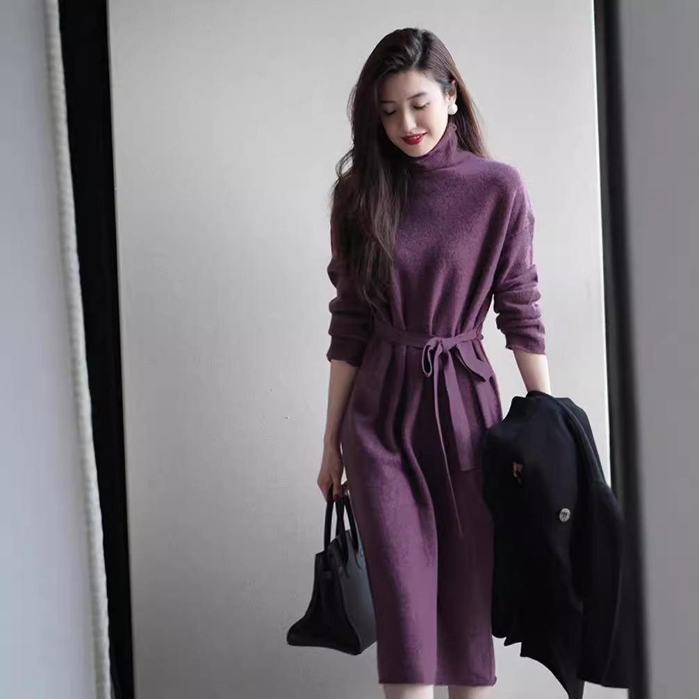秋冬の新型高級感紫カシミヤニットワンピースのロングスカートは膝を過ぎて痩せています。