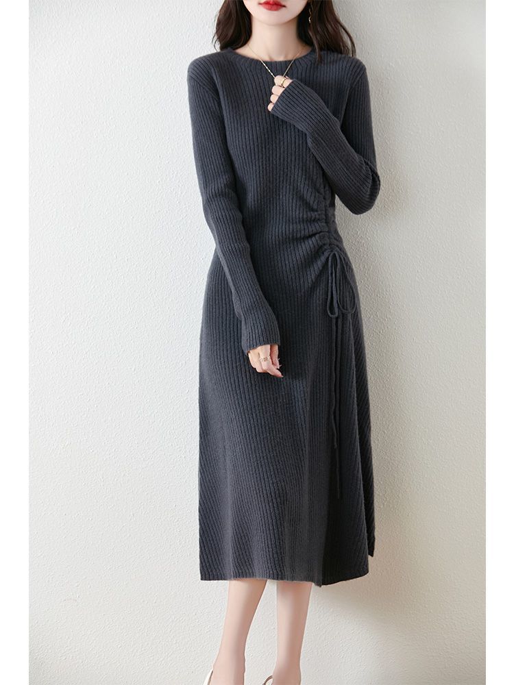 秋冬气质中长款连衣裙女显瘦100%纯羊毛针织裙打底收腰抽绳毛衣裙