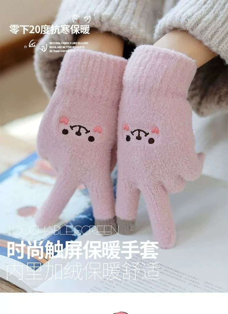 可爱腊肠狗露指触屏毛绒针织手套女冬季保暖学生加绒厚防寒骑行车