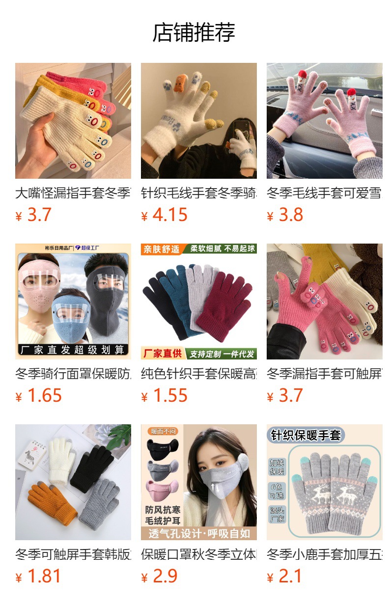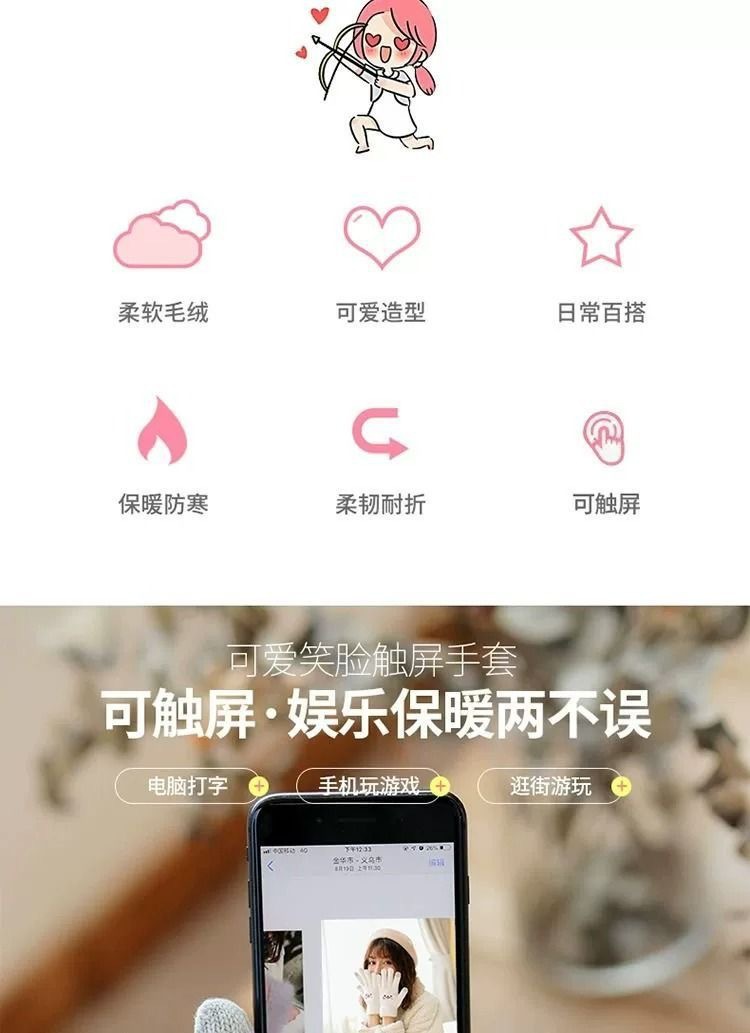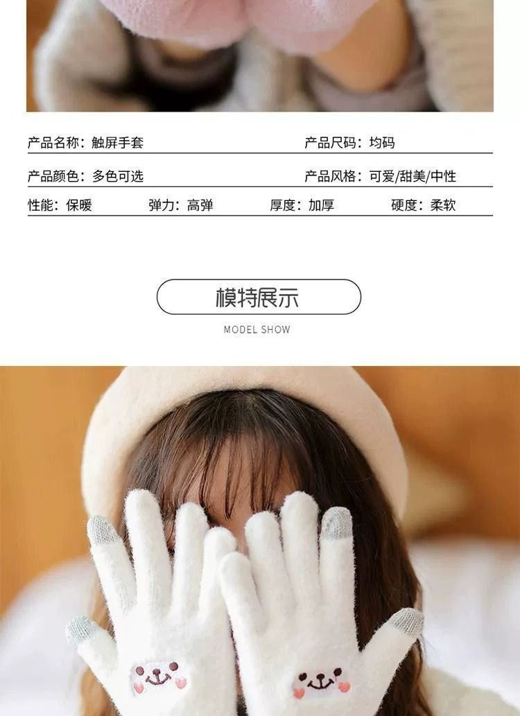 颜色 笑脸手套(白色)刺绣款,笑脸手套(粉色)刺绣款,笑脸手套(卡其色)刺绣款,菠萝纹手套(白色),菠萝纹手套(灰色),菠萝纹手套(橙色),菠萝纹手套(黑色),纯色棉手套(白色),纯色棉手套(浅灰),纯色棉手套(红色),纯色棉手套(蓝色),纯色棉手套(深灰),纯色棉手套(卡其色),纯色棉手套(咖啡),纯色棉手套(黑色),麋鹿针织手套(淡粉色),麋鹿针织手套(深灰色),麋鹿针织手套(卡其色),麋鹿针织手套(西瓜红),麋鹿针织手套(藏青色),麋鹿针织手套(深黑色),小熊触屏手套(白色),小熊触屏手套(粉色),小熊触屏手套(灰色),小熊触屏手套(卡其色),小熊触屏手套(黑色),圣诞触屏手套(浅粉色),圣诞触屏手套(浅灰色),圣诞触屏手套(天蓝色),圣诞触屏手套(卡其色),指尖表情漏指手套(白色),指尖表情漏指手套(粉色),指尖表情漏指手套(灰色),指尖表情漏指手套(黄色),指尖表情漏指手套(黑色)
