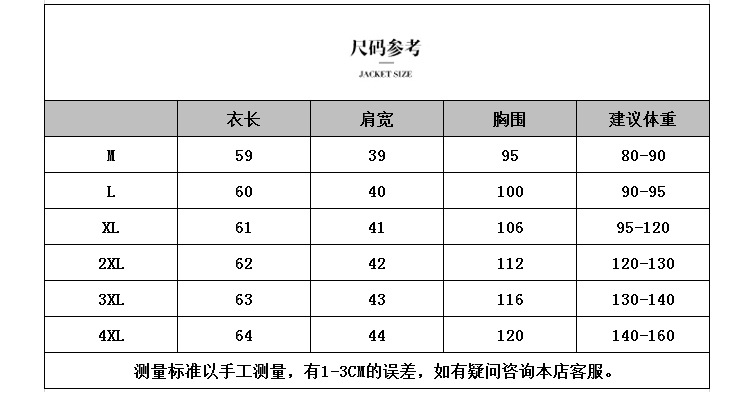 尺码 M建议80-90,L建议90-100,XL建议100-120,2XL建议120-130,3XL建议130-140,4XL建议140-155