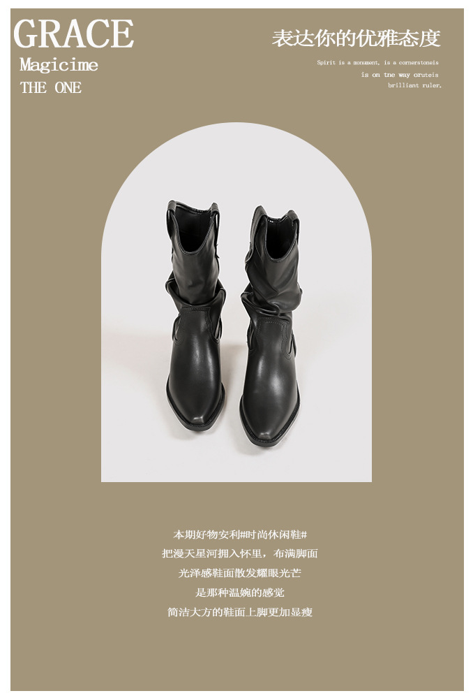 尖头高粗跟褶皱皮带扣装饰拼接短筒靴子女2025秋季新款时尚黑杏棕