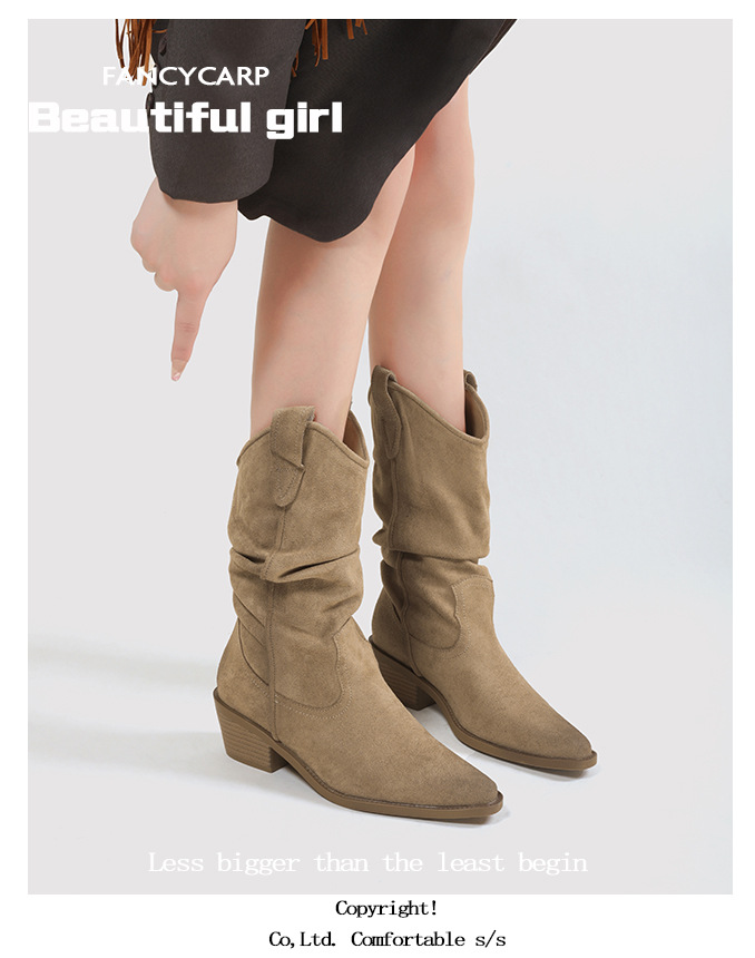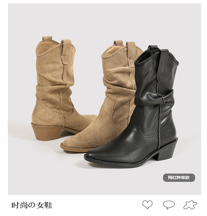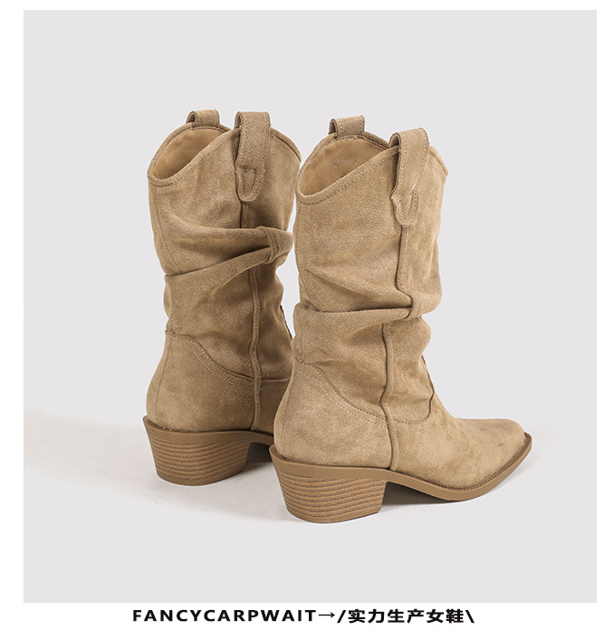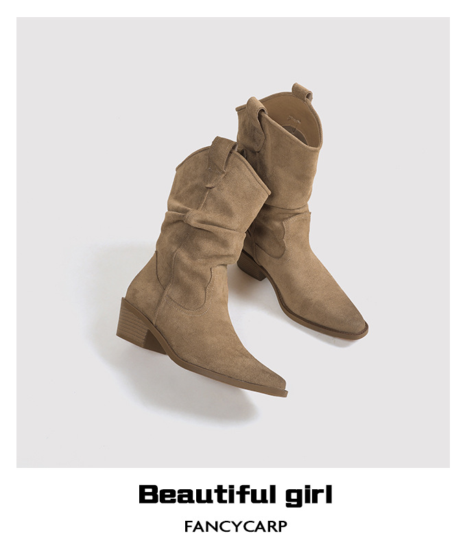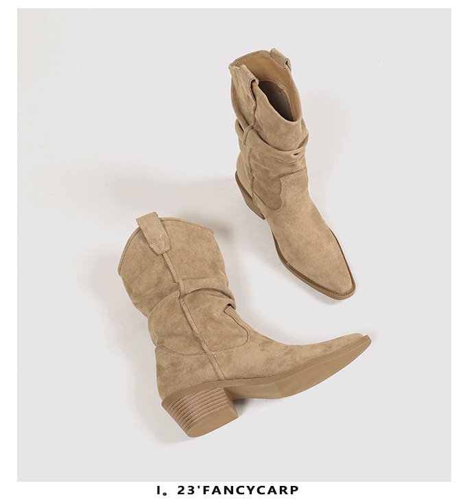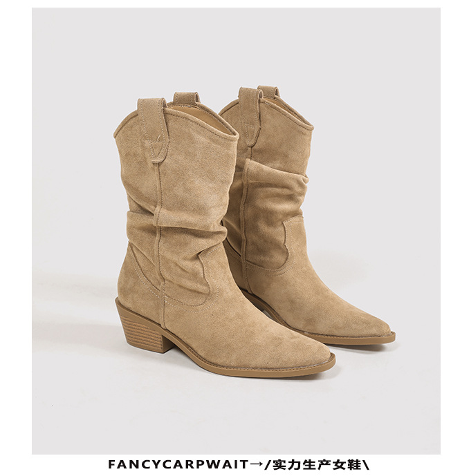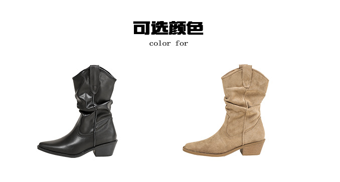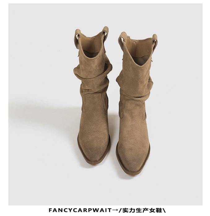 复古绒面尖头堆堆靴短靴女2025秋冬款V口显瘦粗跟西部中筒骑士靴
