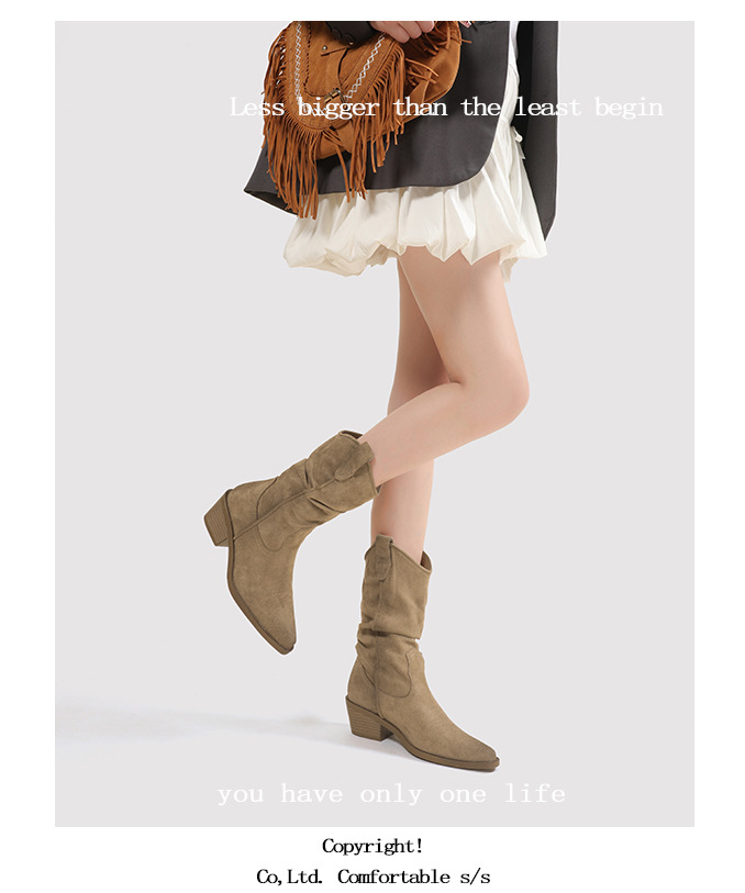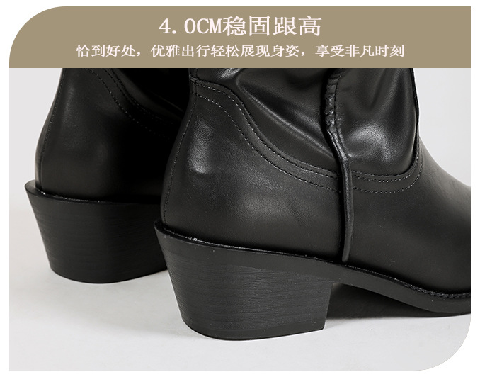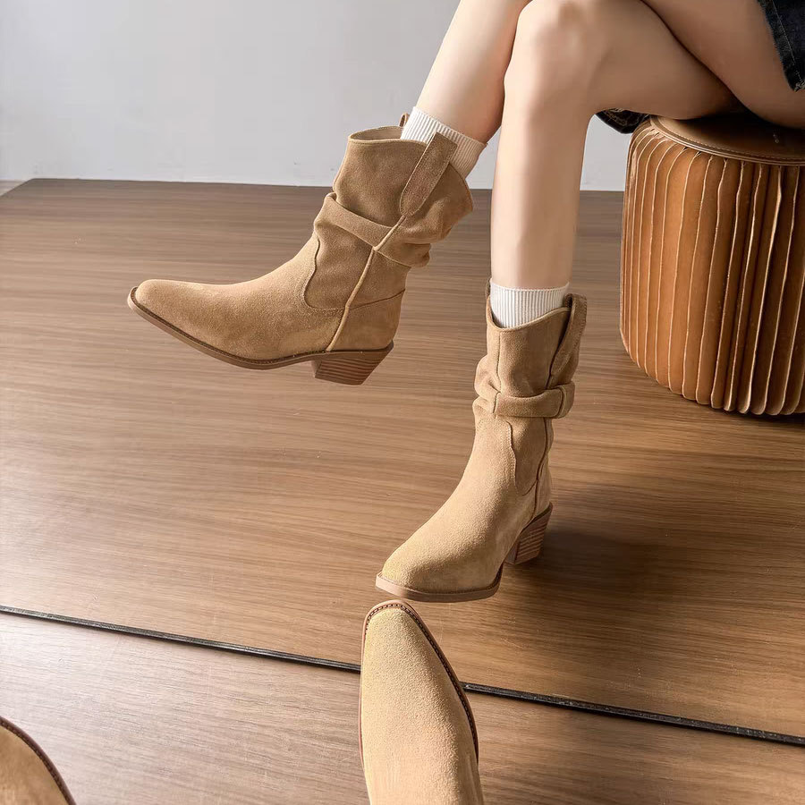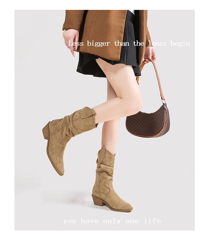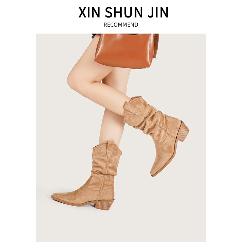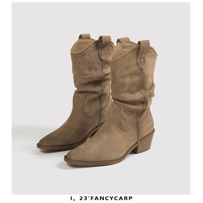 复古绒面尖头堆堆靴短靴女2025秋冬款V口显瘦粗跟西部中筒骑士靴