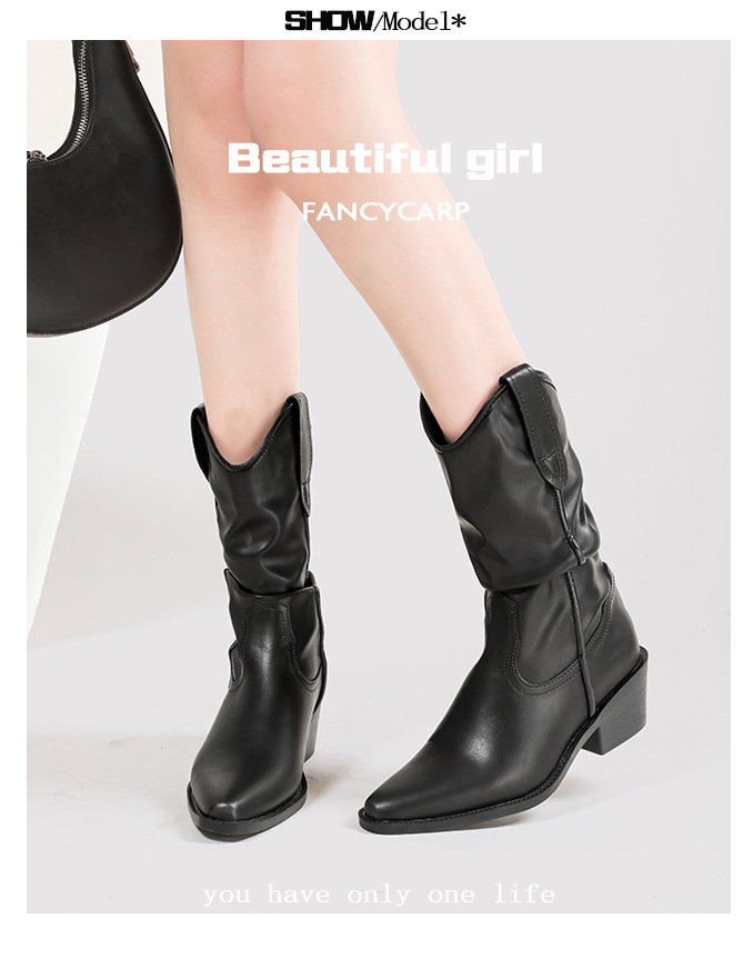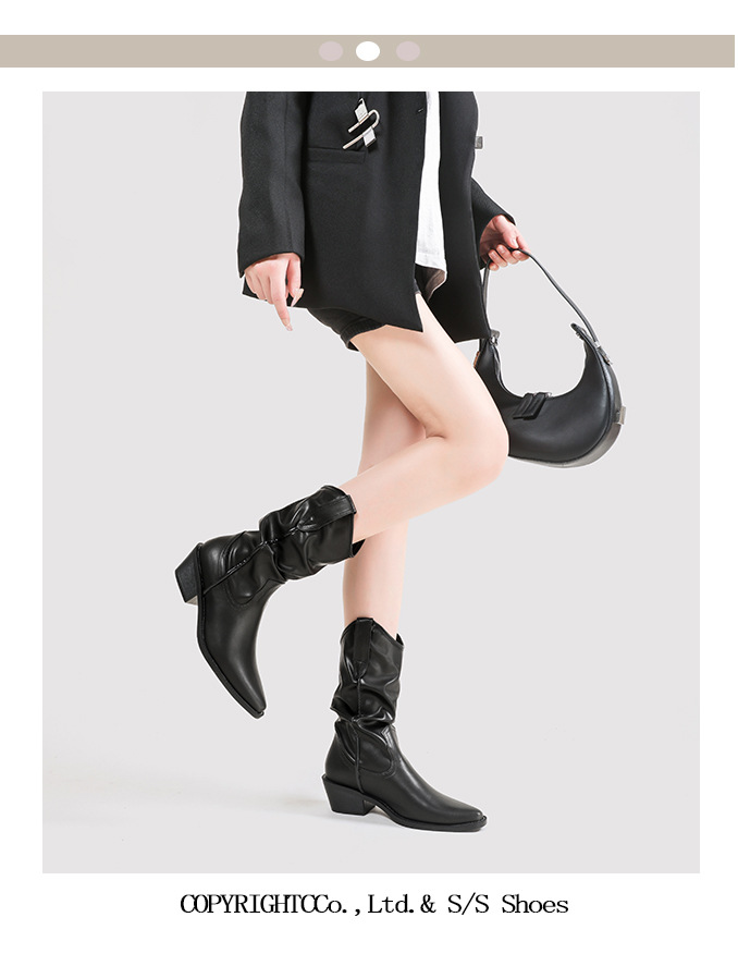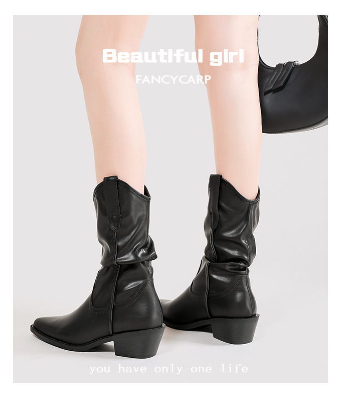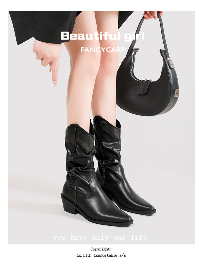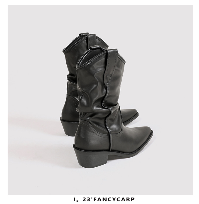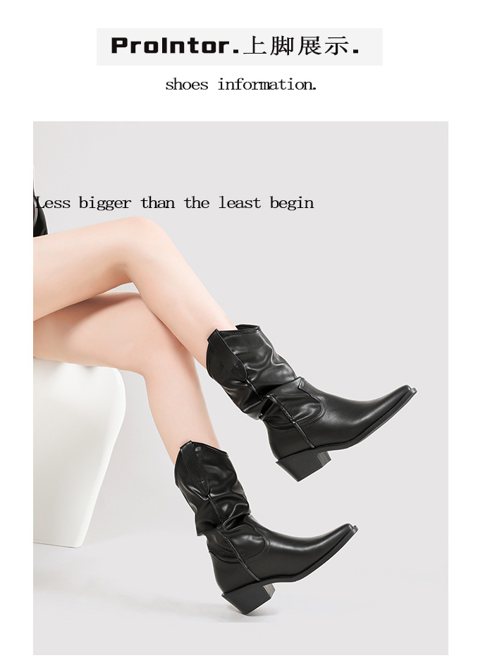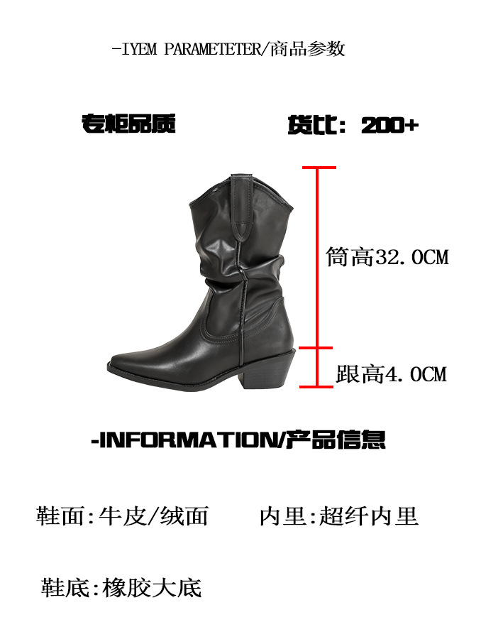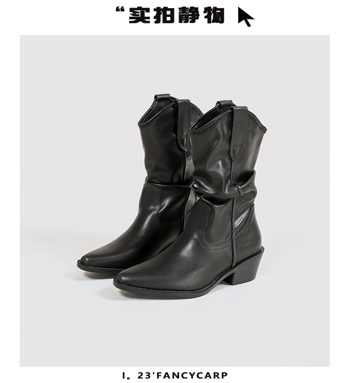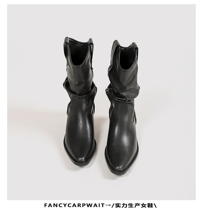 尖头显瘦短靴马丁靴女2025新款秋冬复古粗跟骑士靴褶皱西部堆堆靴