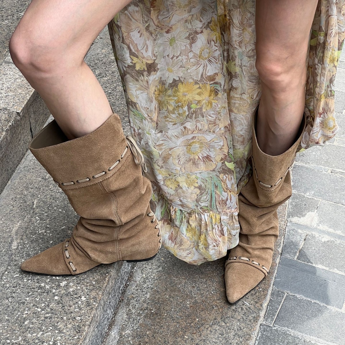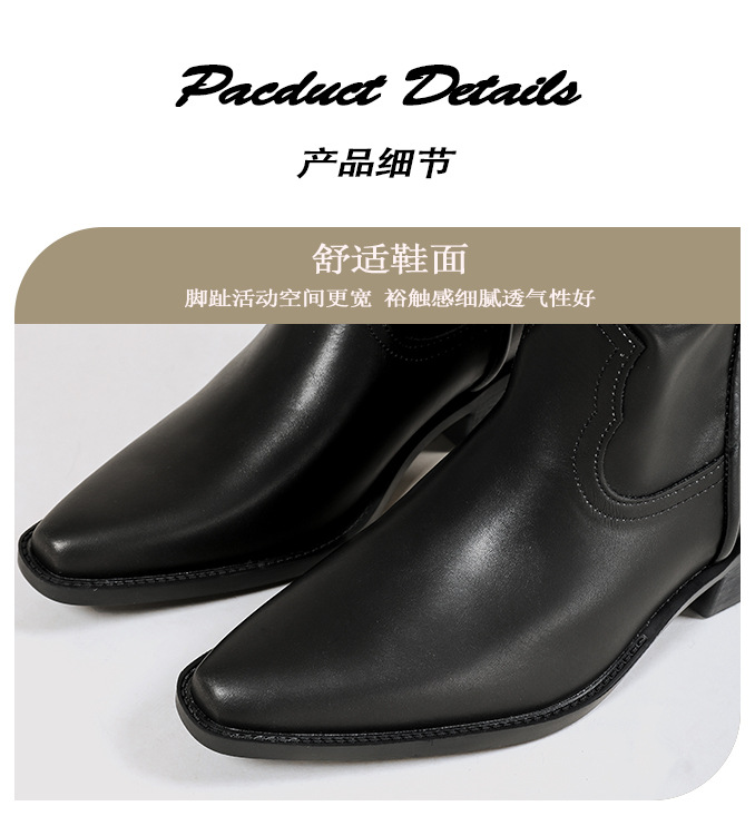 褶皱尖头切尔西靴内增高绑带2025秋新款复古小众美拉德西部牛仔靴