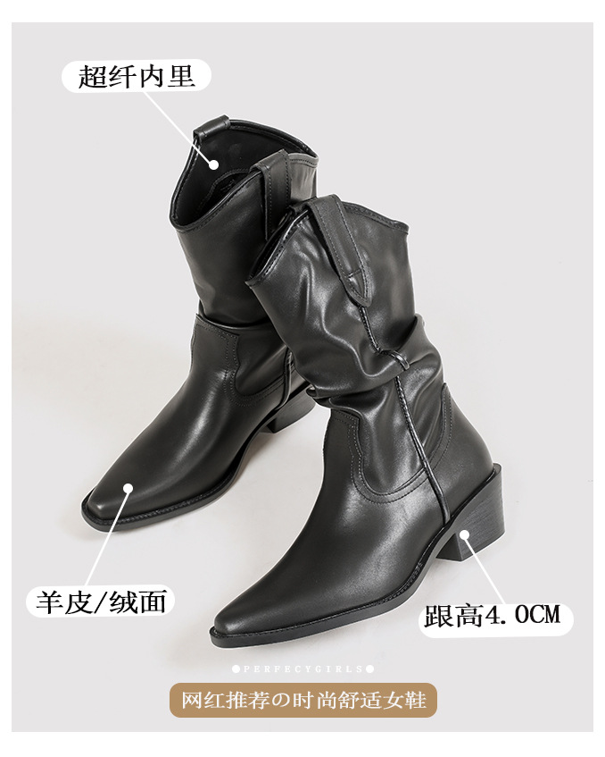 ポインテッドトゥスリムショートブーツマーティンブーツ女性のための2025新しい秋と冬のレトロ太いヒールナイトブーツプリーツウエスタンパイルブーツ