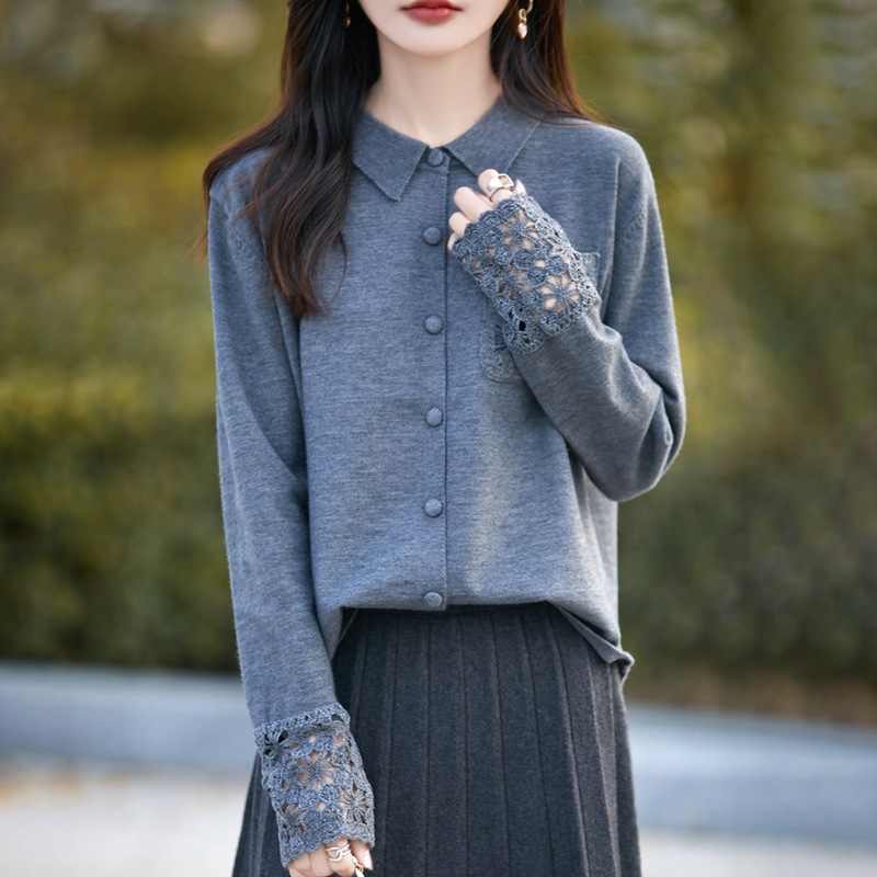 法式POLO翻领蕾丝拼接针织开衫女秋冬新百搭轻奢打底毛衣女装外套