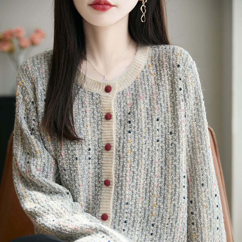 新商品の気質はドリルの丸首のニットのカーディガンの女性のファッション風の優雅でゆったりしています。