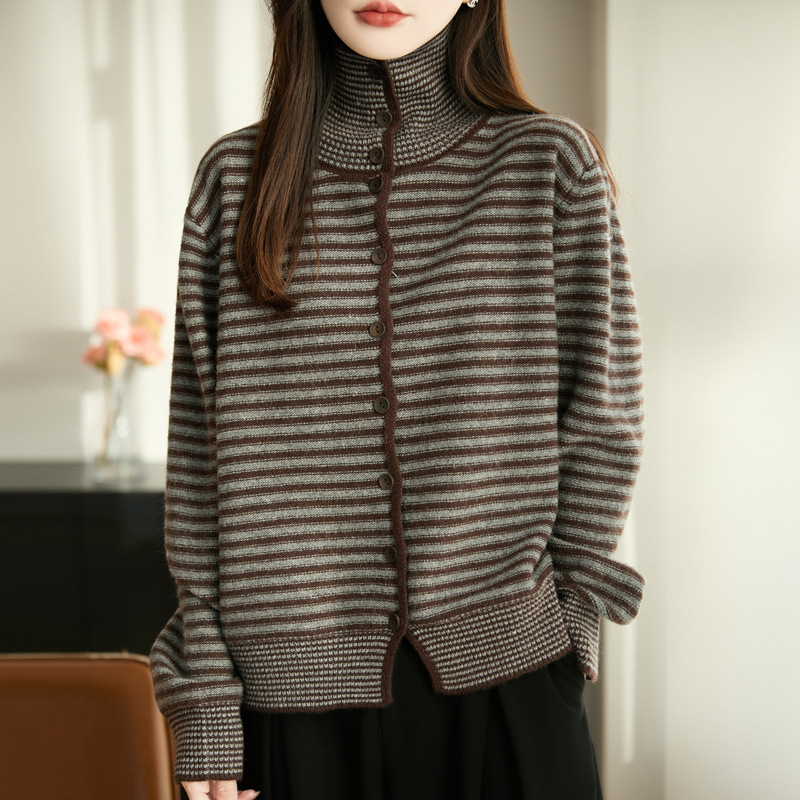 韩系复古条纹高领针织开衫女秋冬新款厚款打底毛衣女装外套上衣