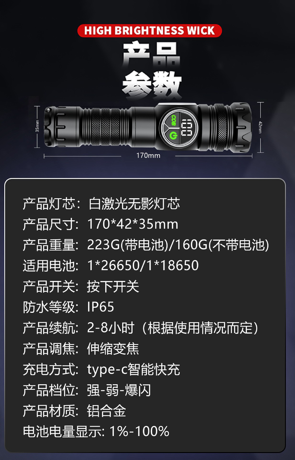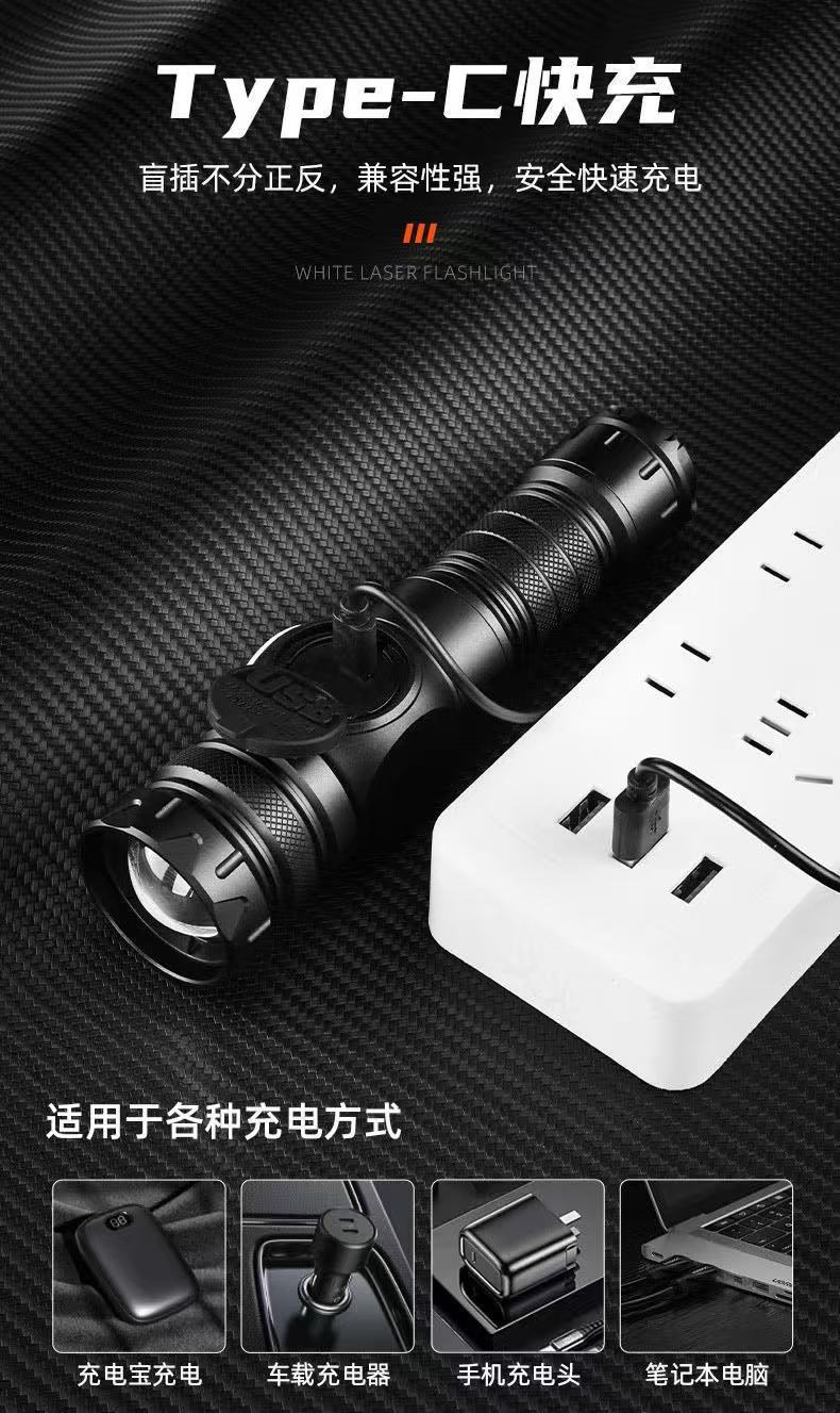 クロスボーダー爆金戸外強光ズーム防水懐中電灯type-c急速充電長航続爆亮遠射レーザー砲
