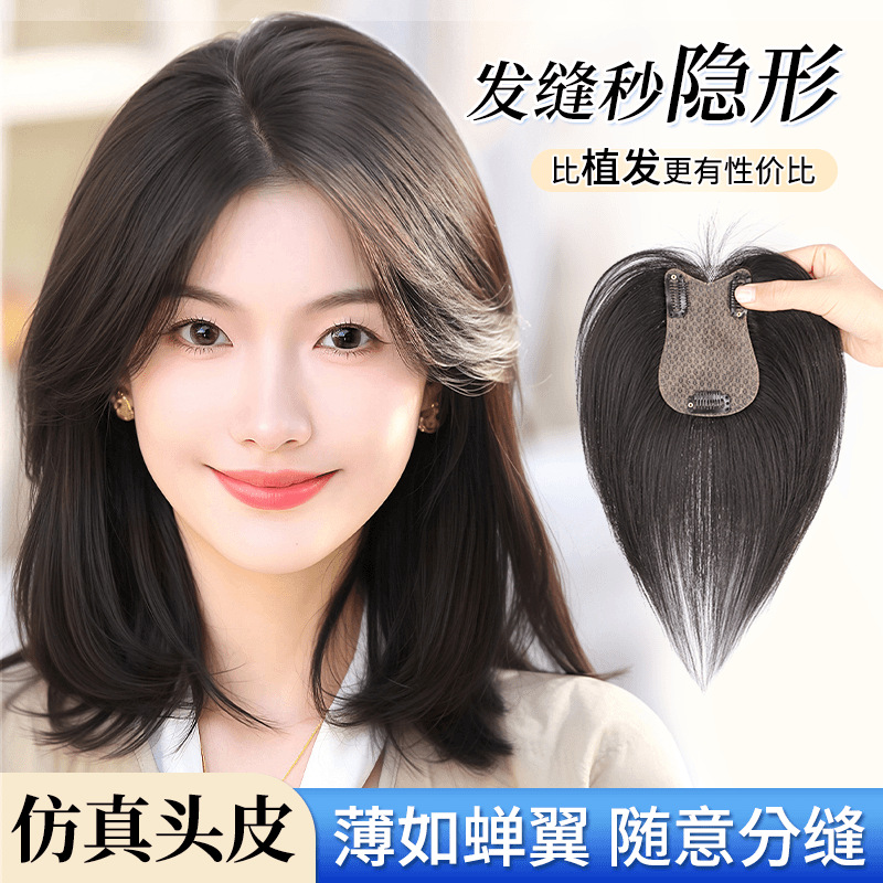 女性用ヘアピース、頭頂部隠し、高頭頂用かつら、人毛、自然で薄い、増毛、前髪付きヘアピース