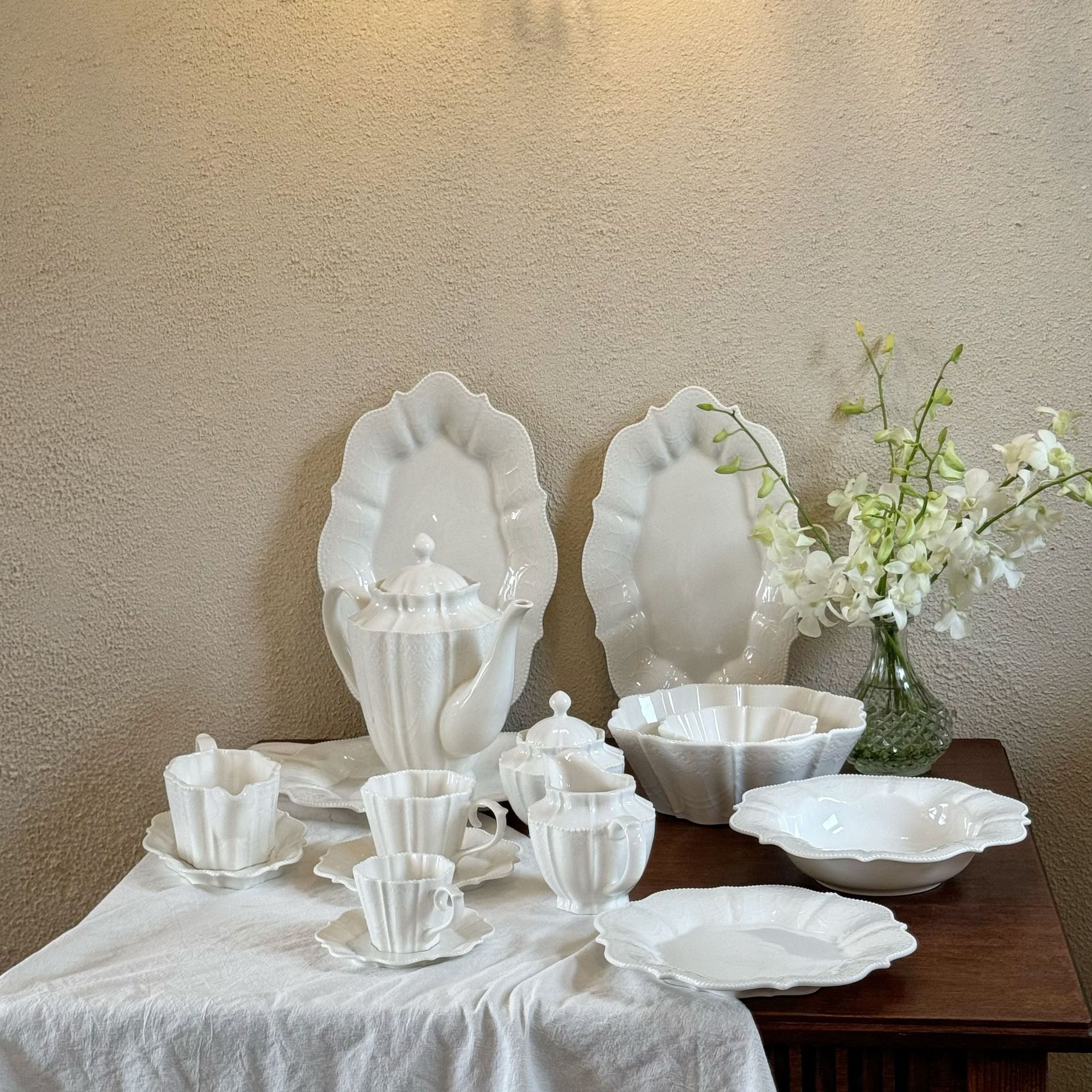 レトロなフランス式レリーフレース純白レースセラミック食器カップ高足盤中古重工シリーズ