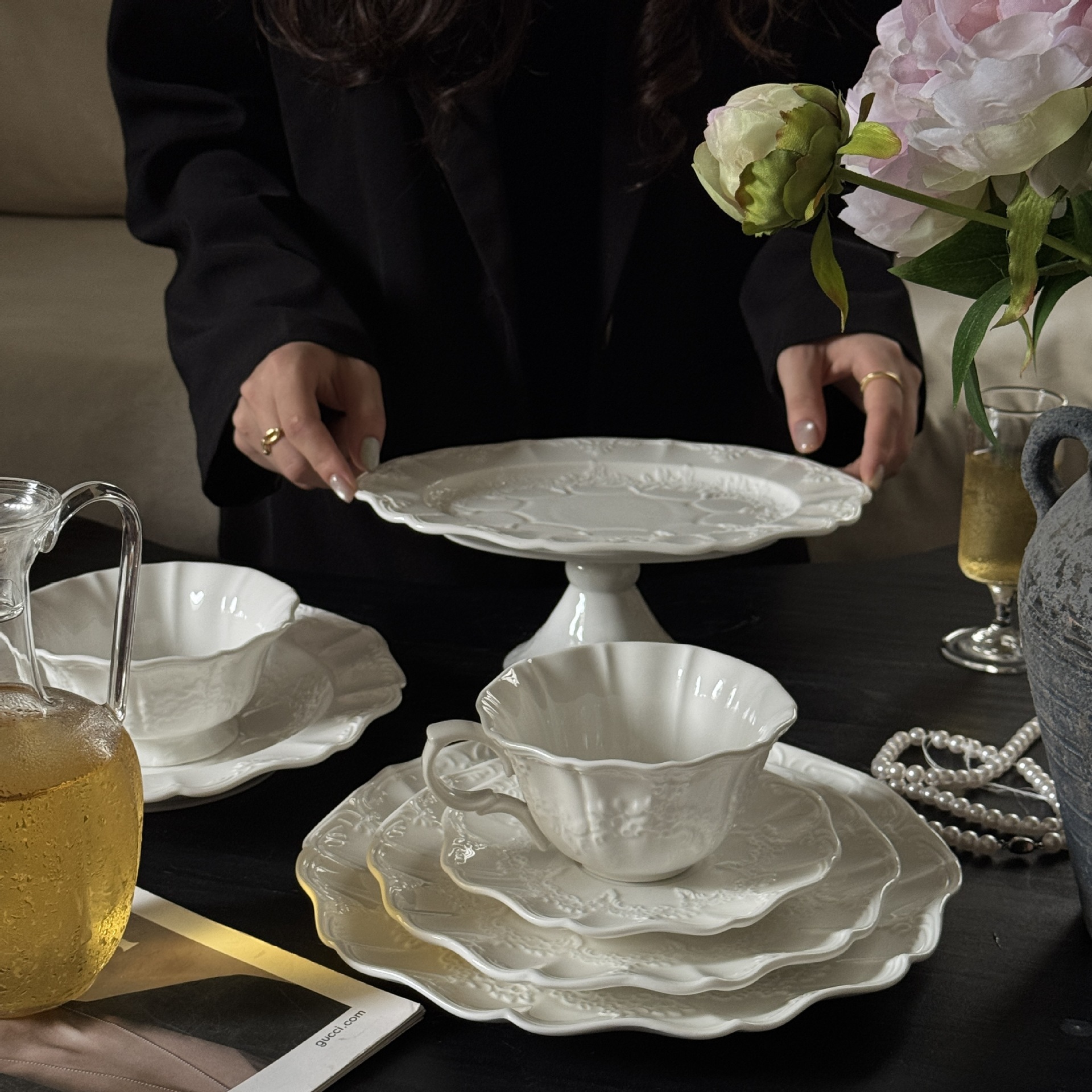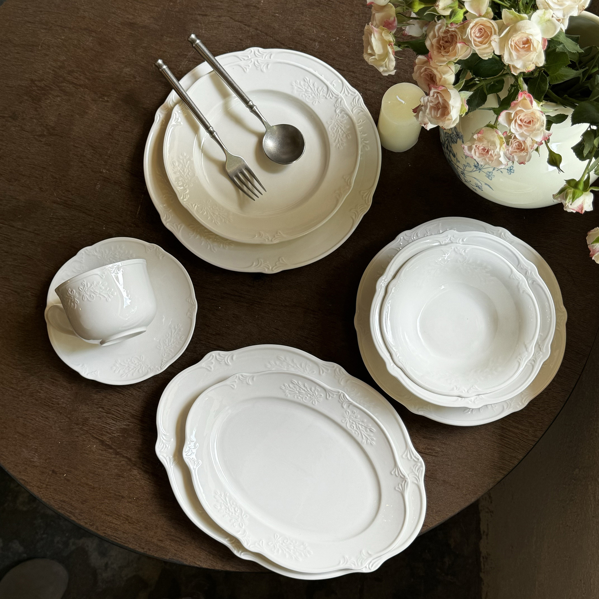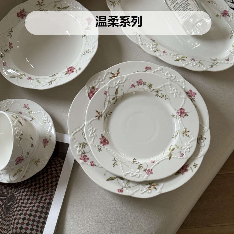 フレンチミッドセンチュリーホリデーロマンチックローズマナー エンボスフラワーセラミックプレートボウル デザートプレート スーププレート 食器セット