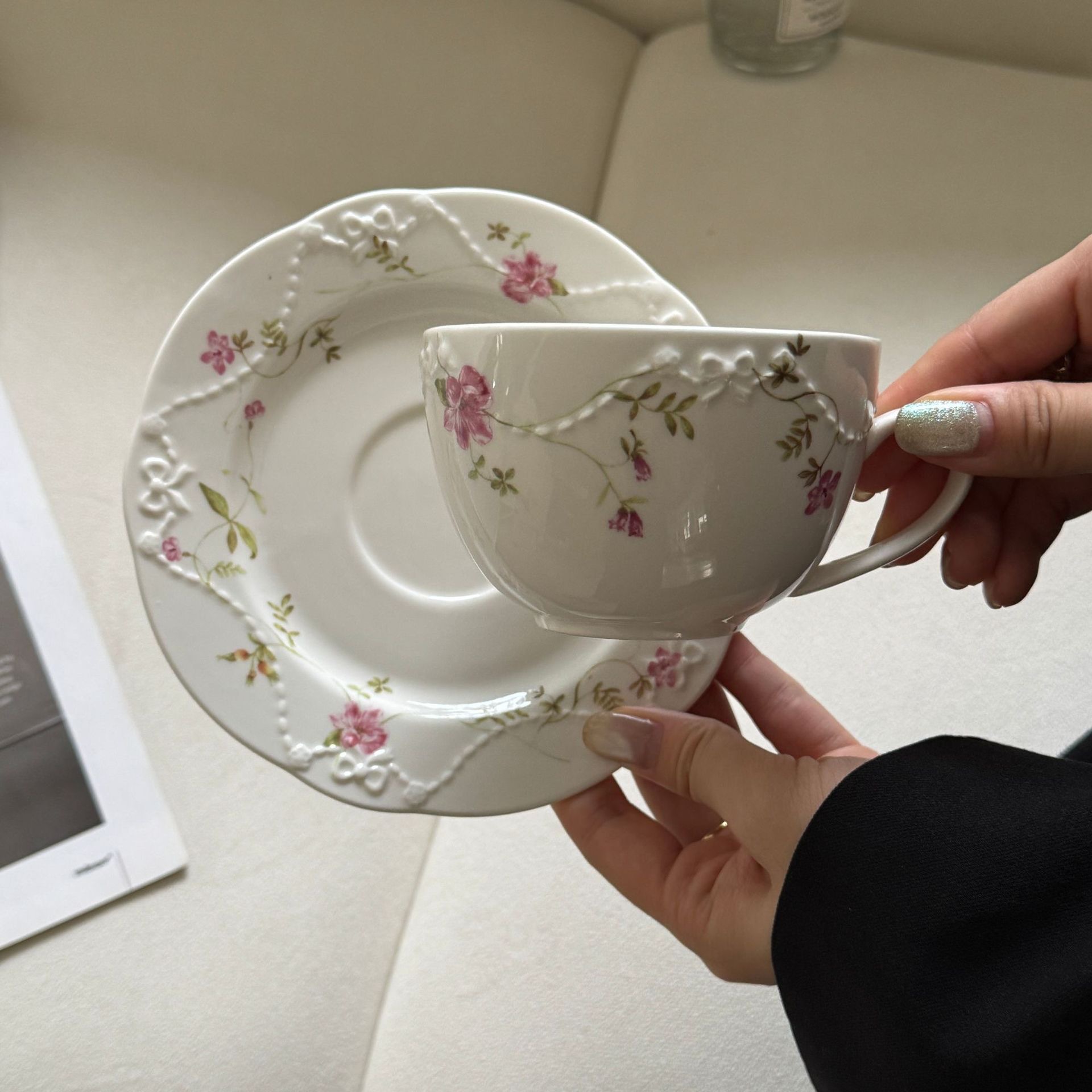 新商品超美女心ピンク花卉レリーフ陶磁器シリーズランチカップ皿ケーキ高足皿