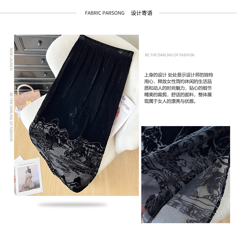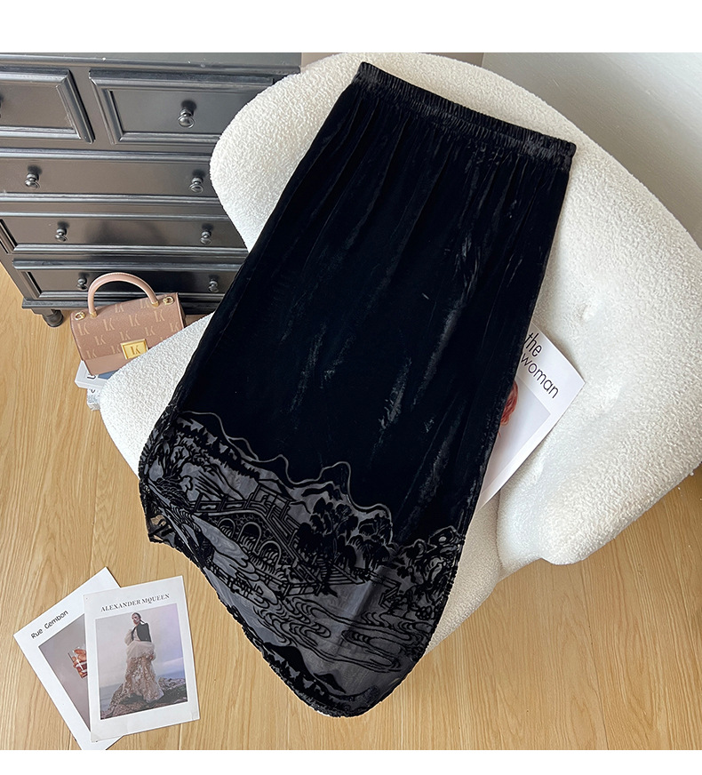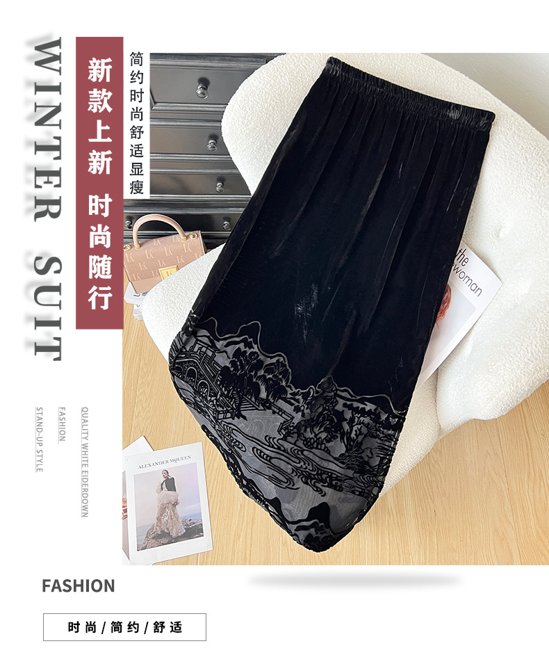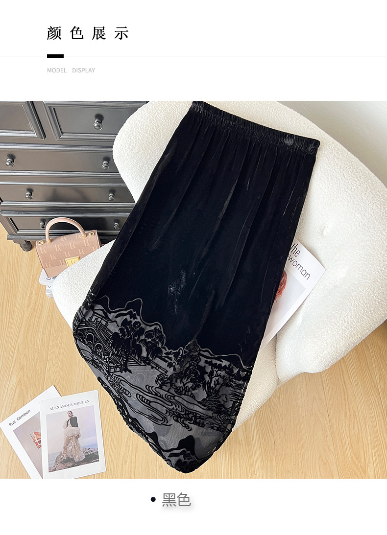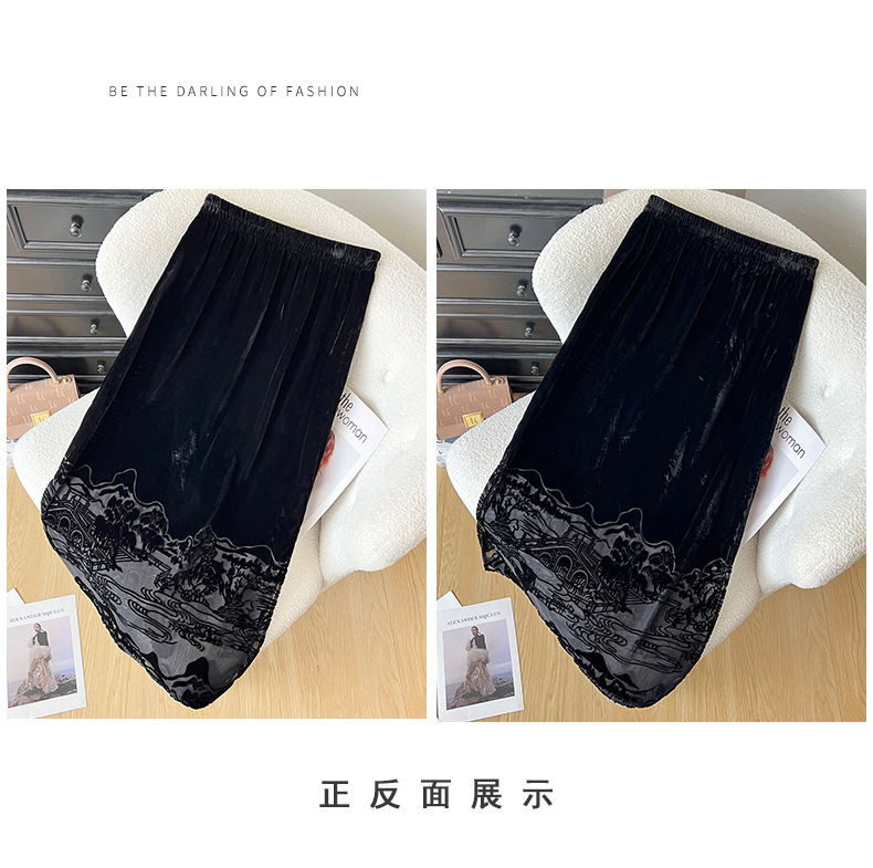 2025秋季爆款丝绒烧花半身裙女黑色显瘦气质百搭裙子中式国风长裙