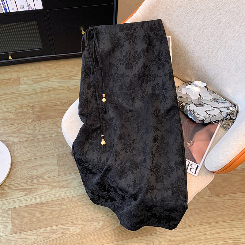 国風レトロジャカード酢酸サテンスカート女性新中国式オープンフォークヒップスカート