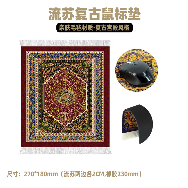 这款鼠标垫的规格是270*180mm,不含流苏的尺寸是230*180mm,底部的橡胶2mm,总厚大概是2.5mm,其他的尺寸也可以定做。