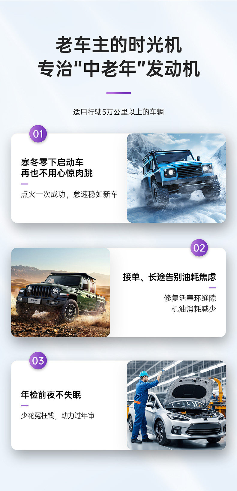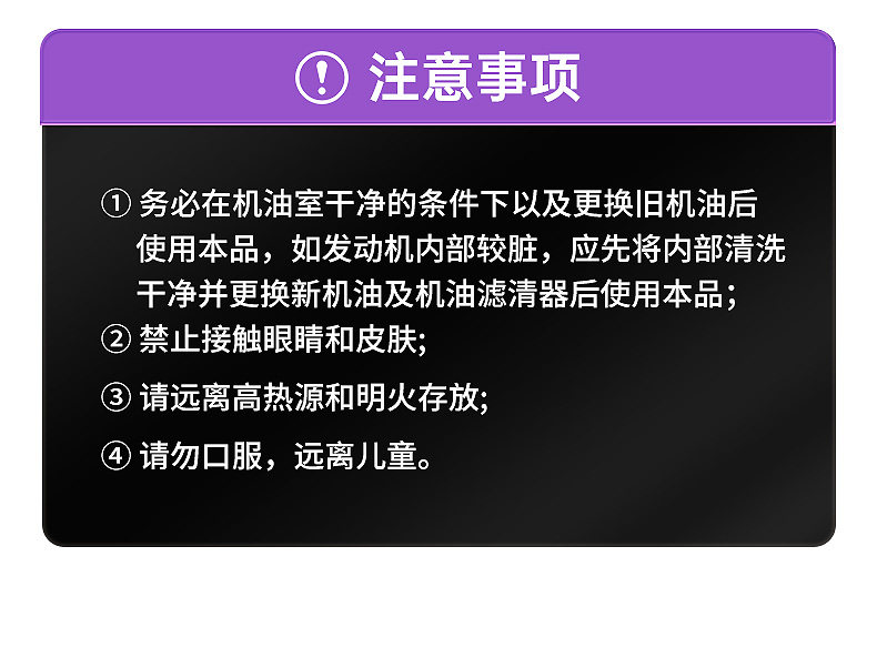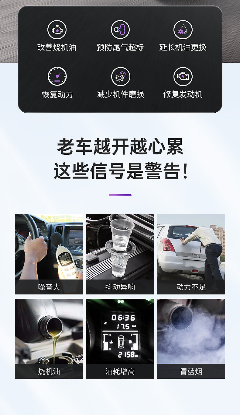 包装规格 【旗舰款】发动机强力修复剂,【先清洗后治理】发动机内部清洗剂+超级机油精送燃油宝,【先清洗后修复】发动机内部清洗剂+强力修复剂,【减少机件磨损】发动机强力修复剂两瓶装,【抗磨养护】发动机抗磨保护剂,【噪音抖动】发动机噪音抖动修复剂,【轻微烧机油】超级机油精,【先清洗后治理】发动机内部清洗剂+噪音修复剂,【重度烧机油】机油宝,【先清洗后养护】发动机内部清洗剂+抗磨保护剂,【预防尾气超标】发动机强力修复剂三瓶装,【延长机油更换】发动机强力修复剂1瓶