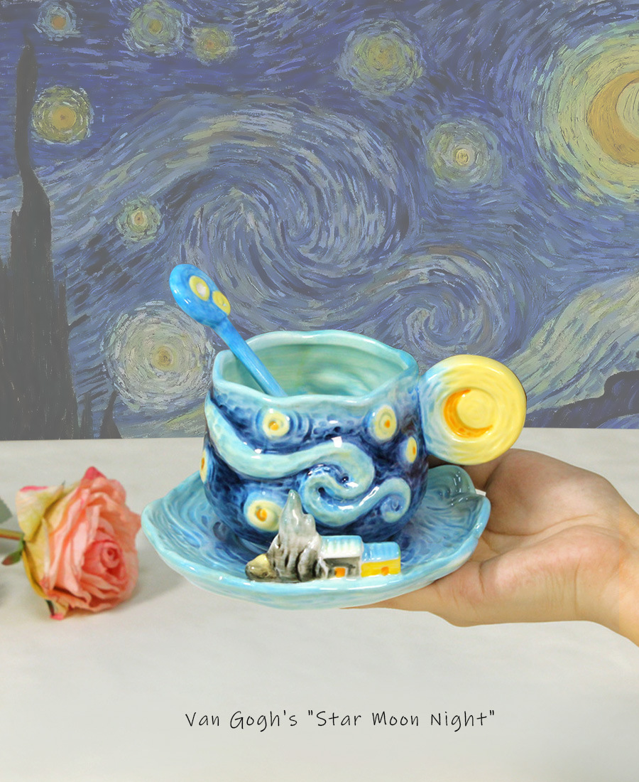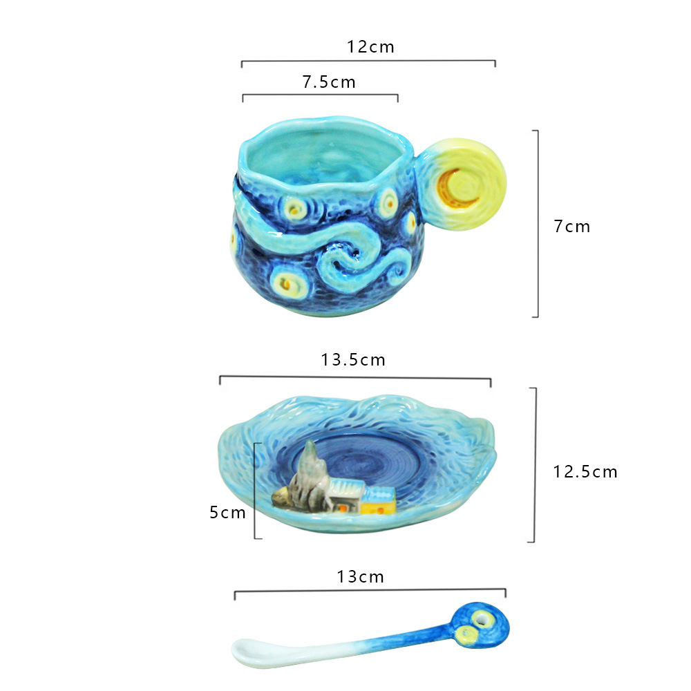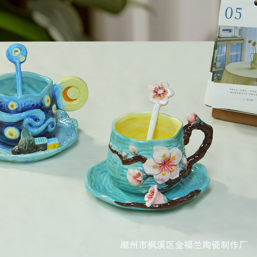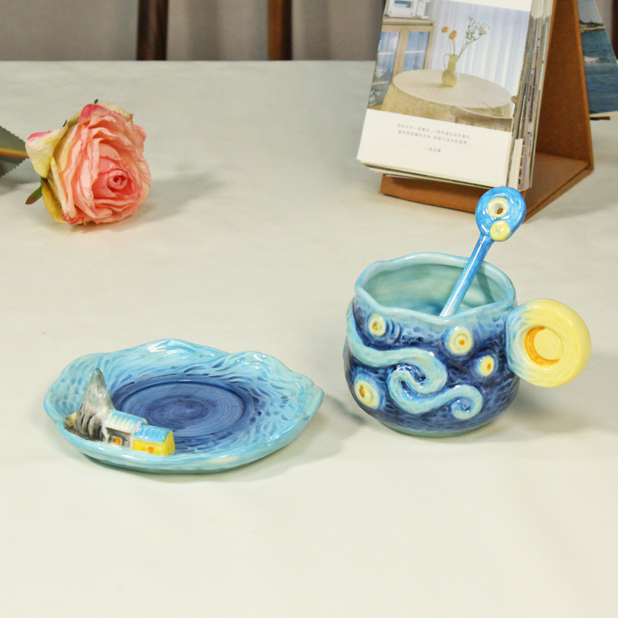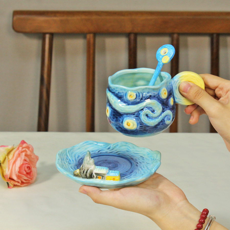 A8T手描きゴッホ詩意星空カップ陶磁器カップセットコーヒーカップカップカップとスプーンカップの花セット午後