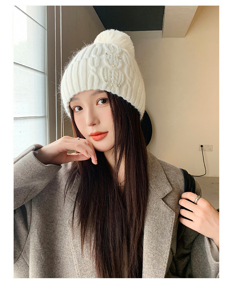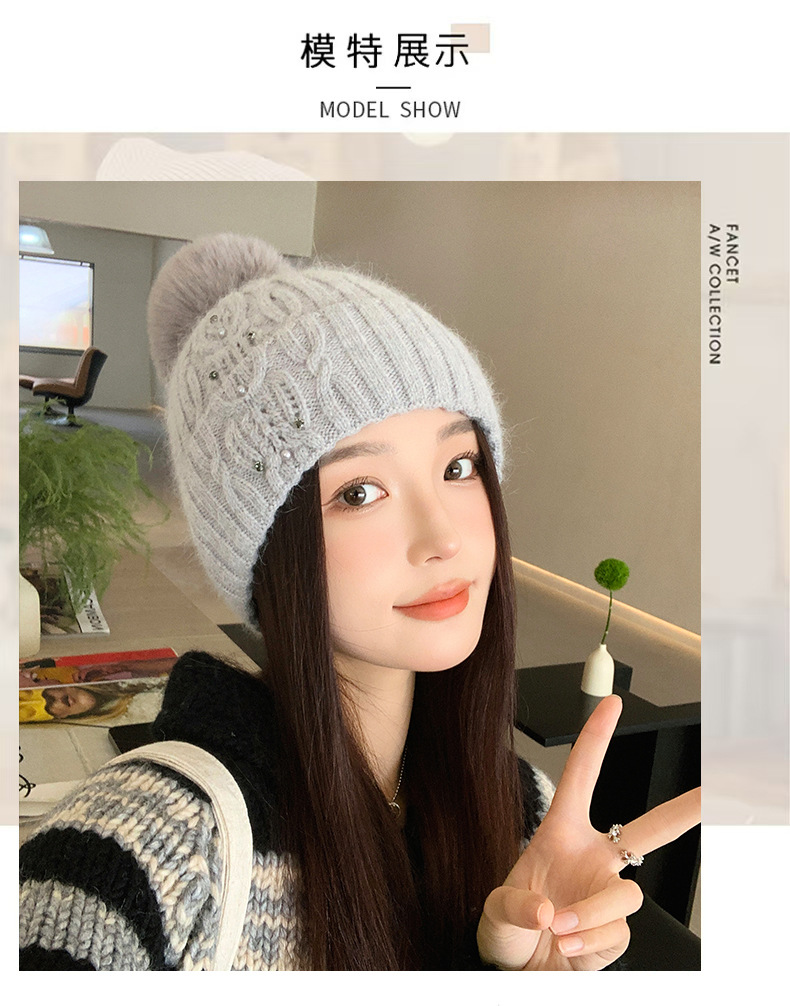 新款亮钻兔毛针织帽秋冬女时尚优雅盆帽中老年人加厚保暖毛线帽子