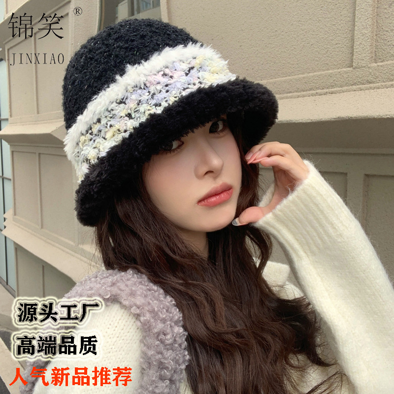 秋冬新款针织条纹渔夫帽子女加厚毛绒保暖护耳水桶帽百搭显脸小潮