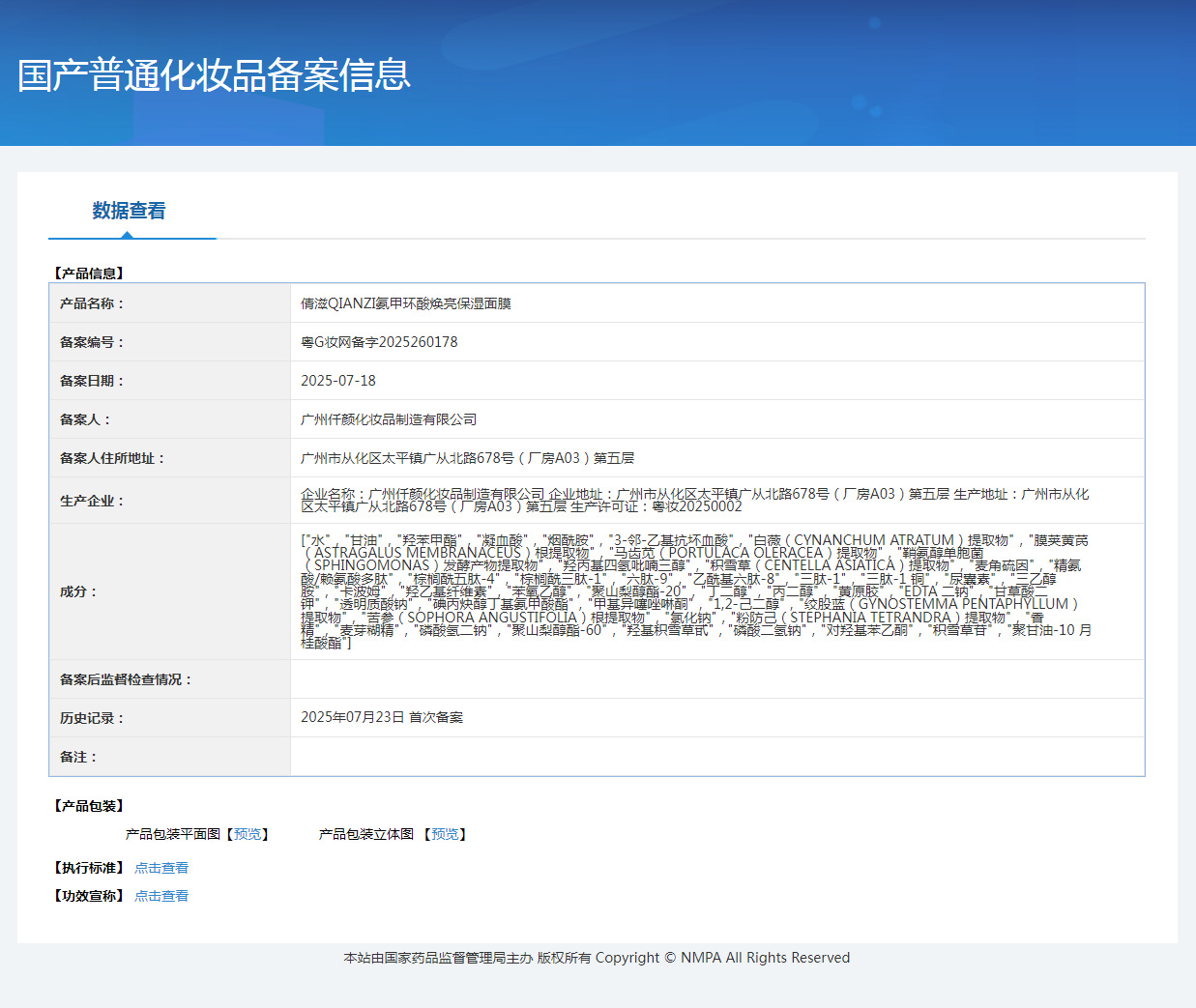 产品规格 倩滋QIANZI氨甲环酸焕亮保湿面膜