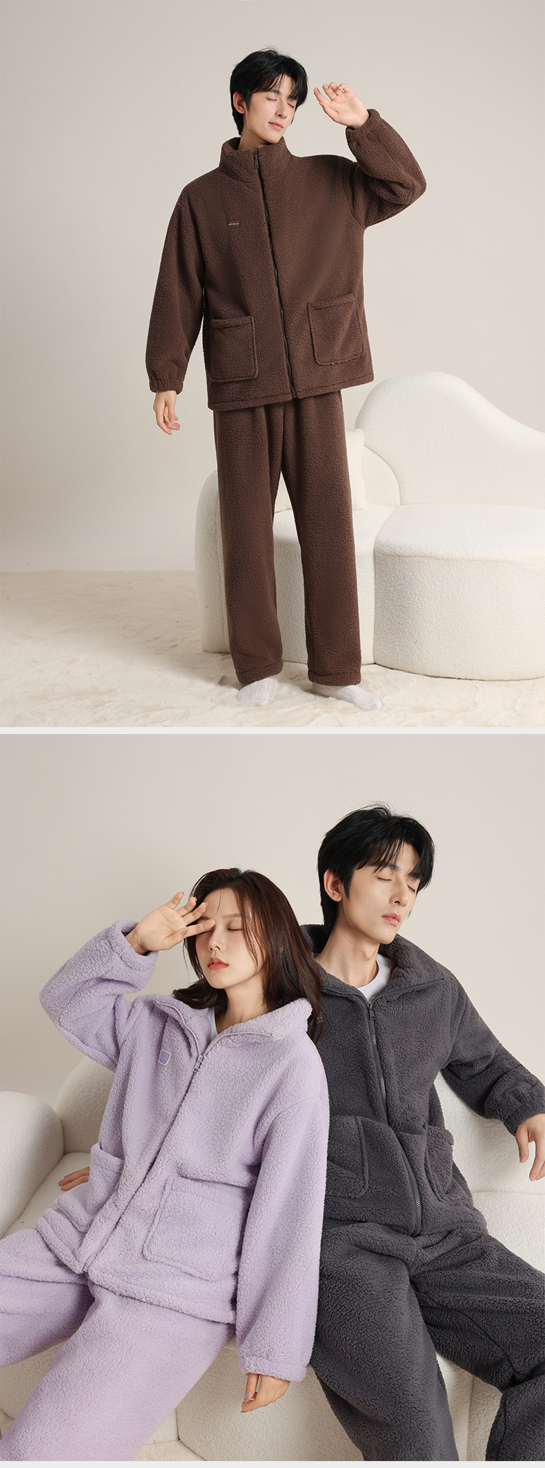 秋冬新款情侣拉链睡衣加绒加厚男女款家居服珊瑚绒宽松可外穿套装