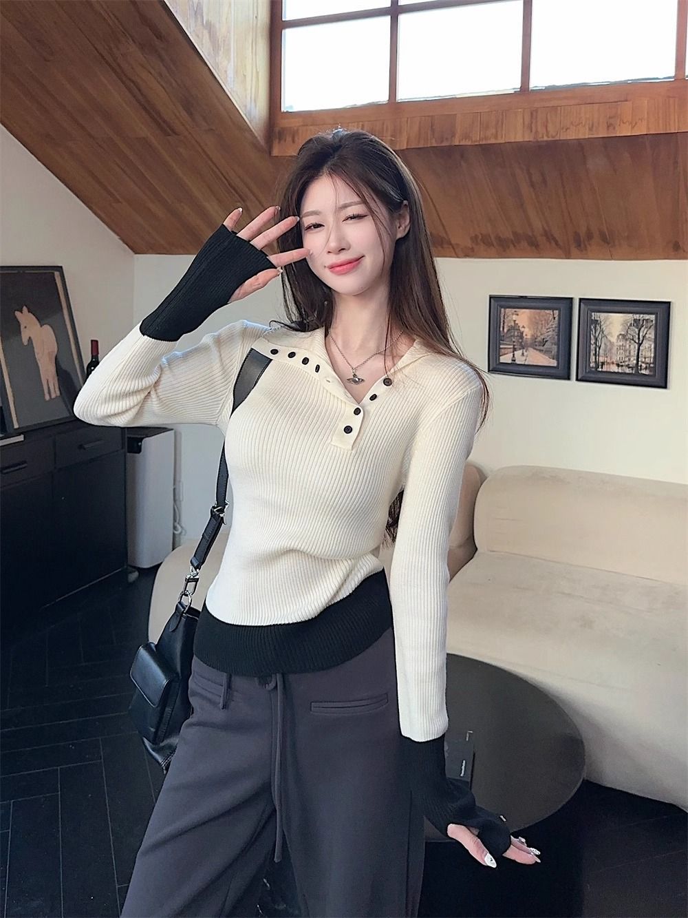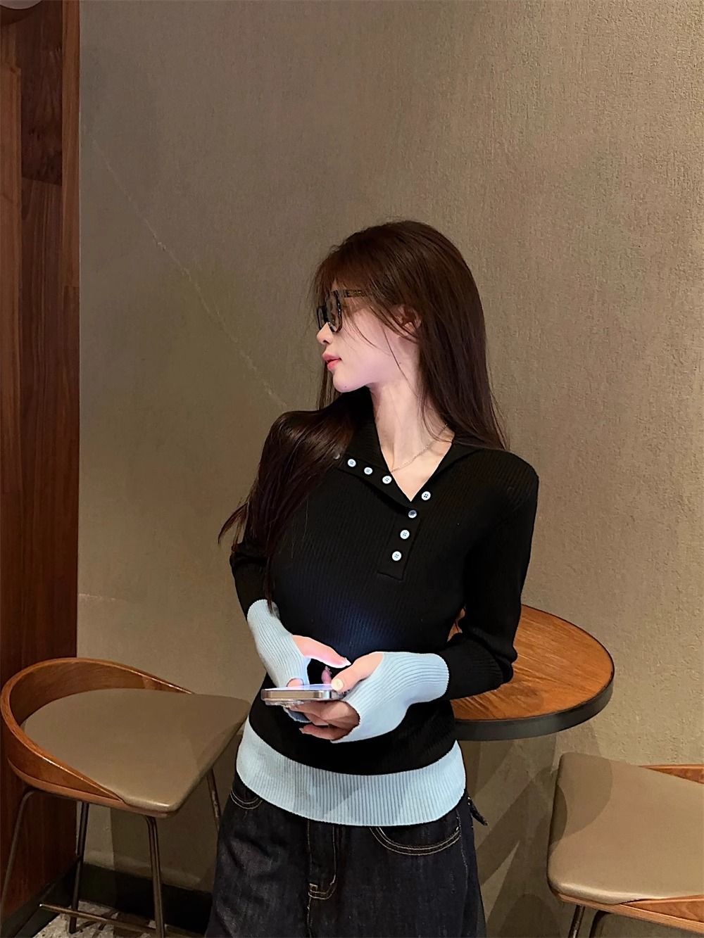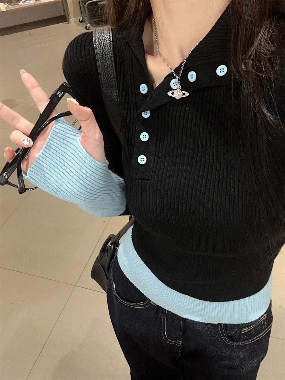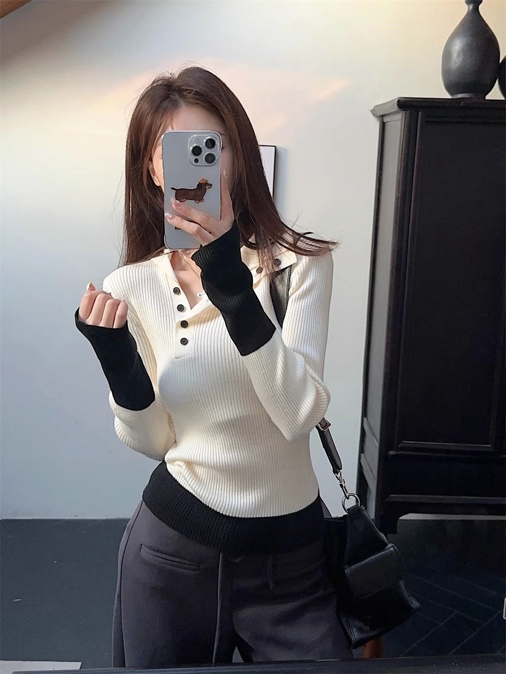 拼接撞色设计感翻领打底毛衣女春秋季修身显瘦气质加厚内搭针织衫