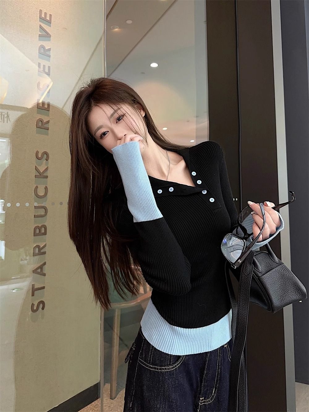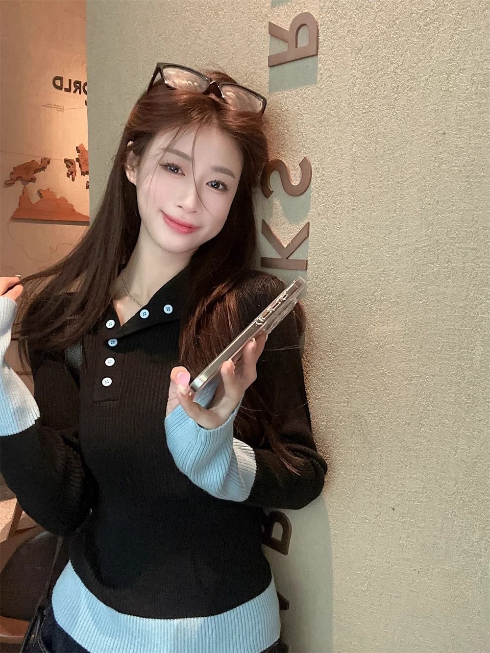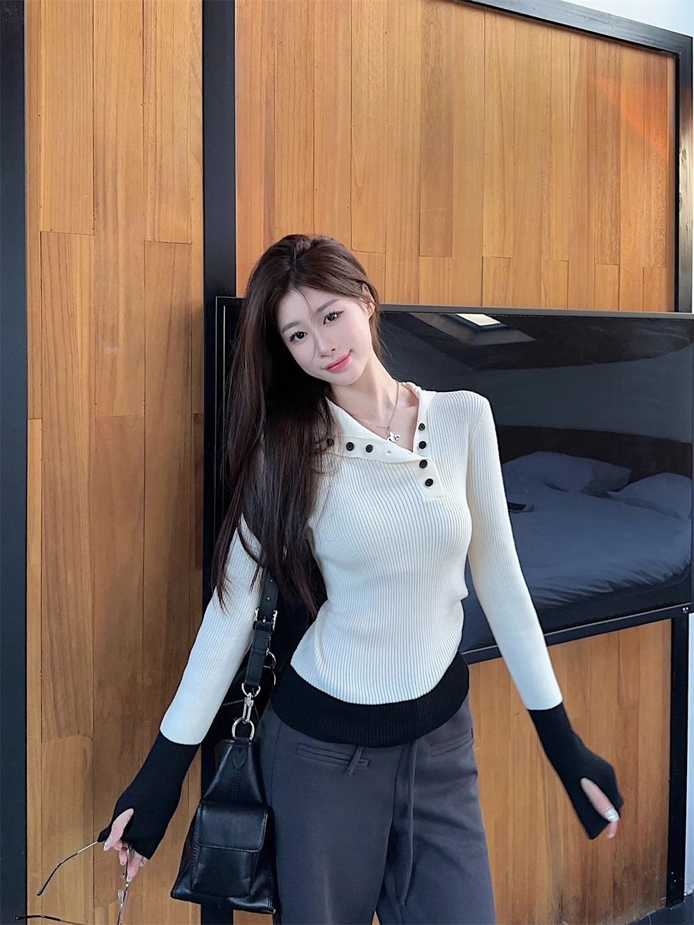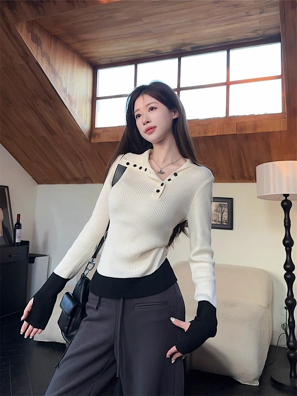 拼接撞色设计感翻领打底毛衣女春秋季修身显瘦气质加厚内搭针织衫