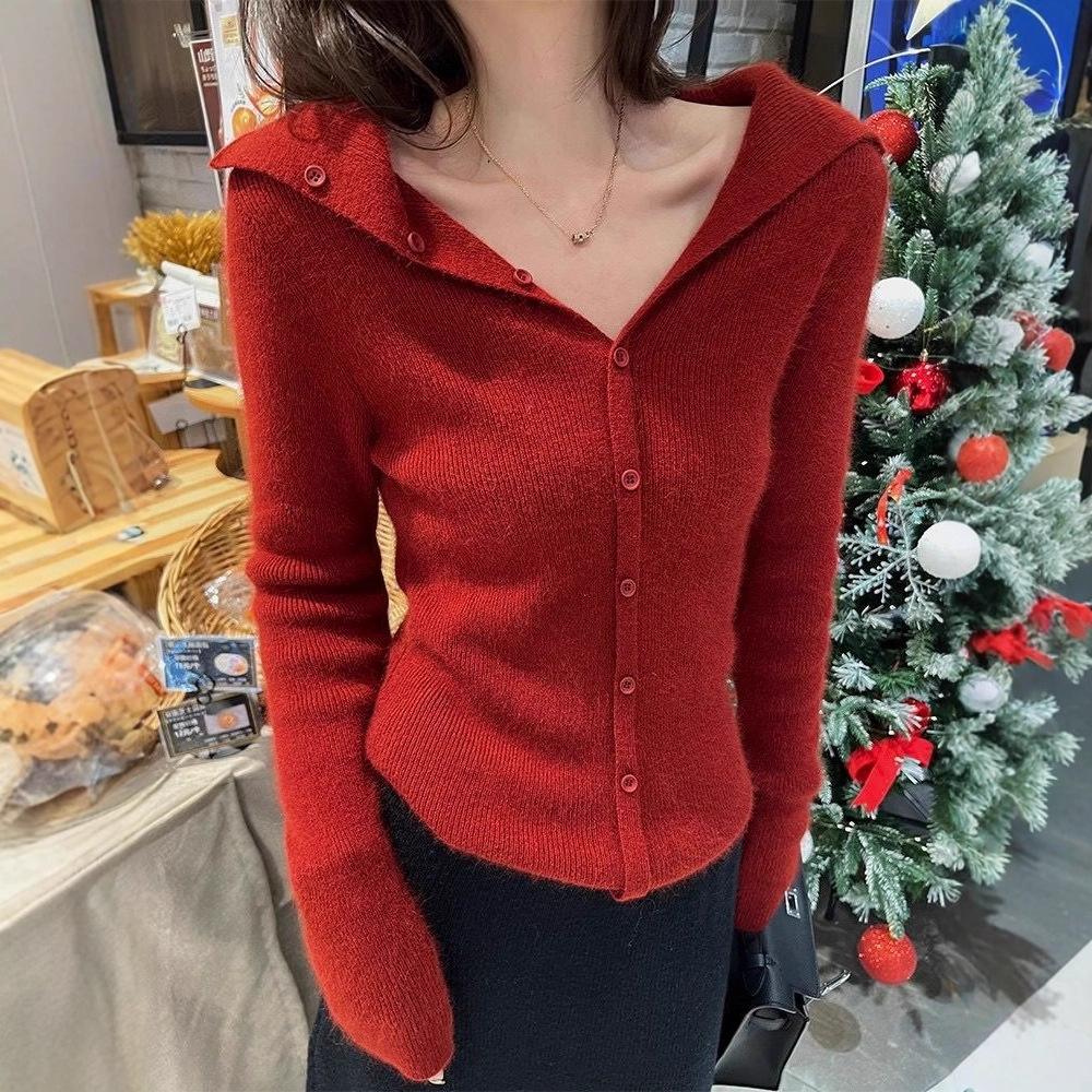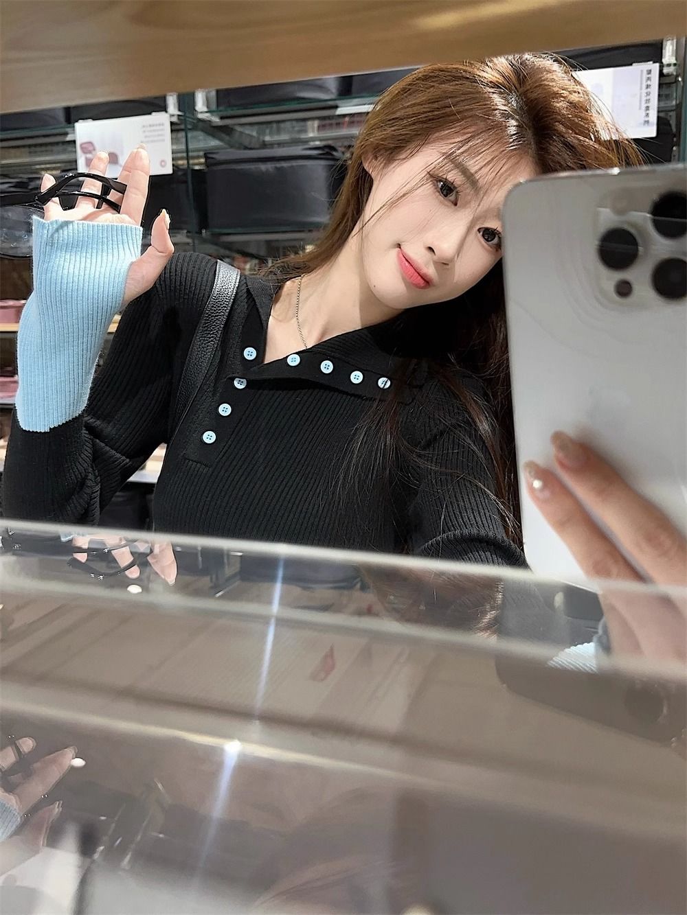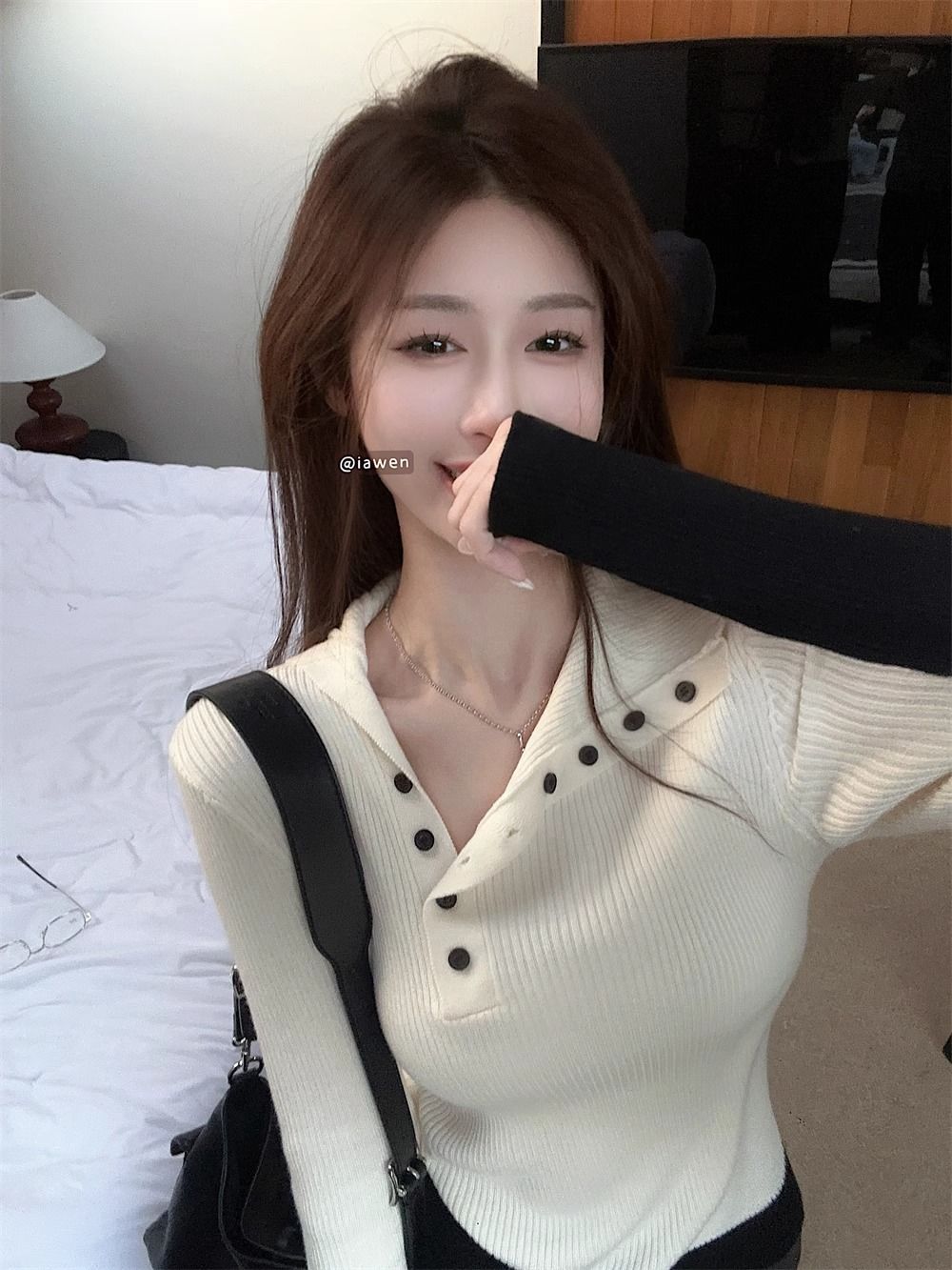 韩系翻领毛衣针织打底衫女秋冬季法式高级设计感修身纽扣内搭上衣