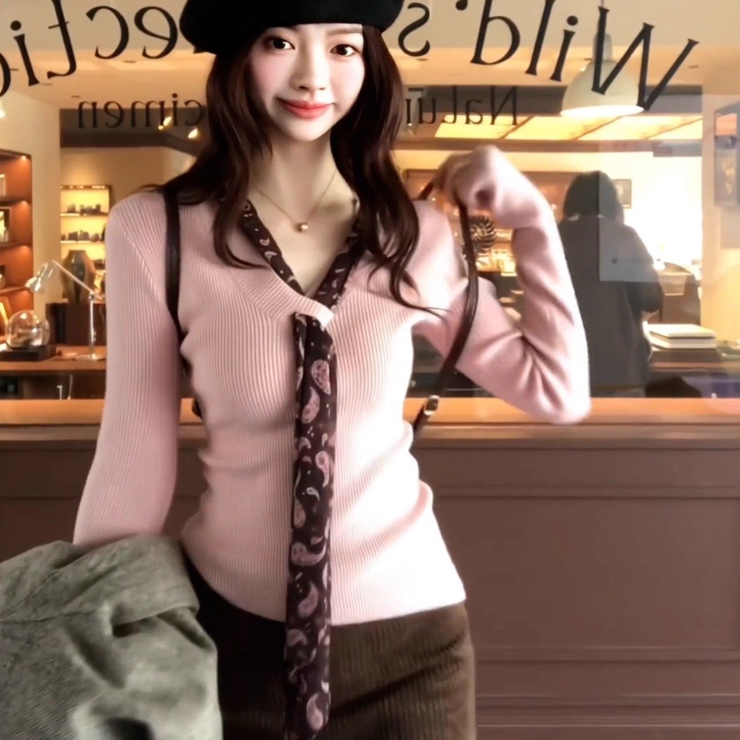 2025新款韩系设计感粉色v领针织毛衣秋冬季修身内搭打底长袖上衣