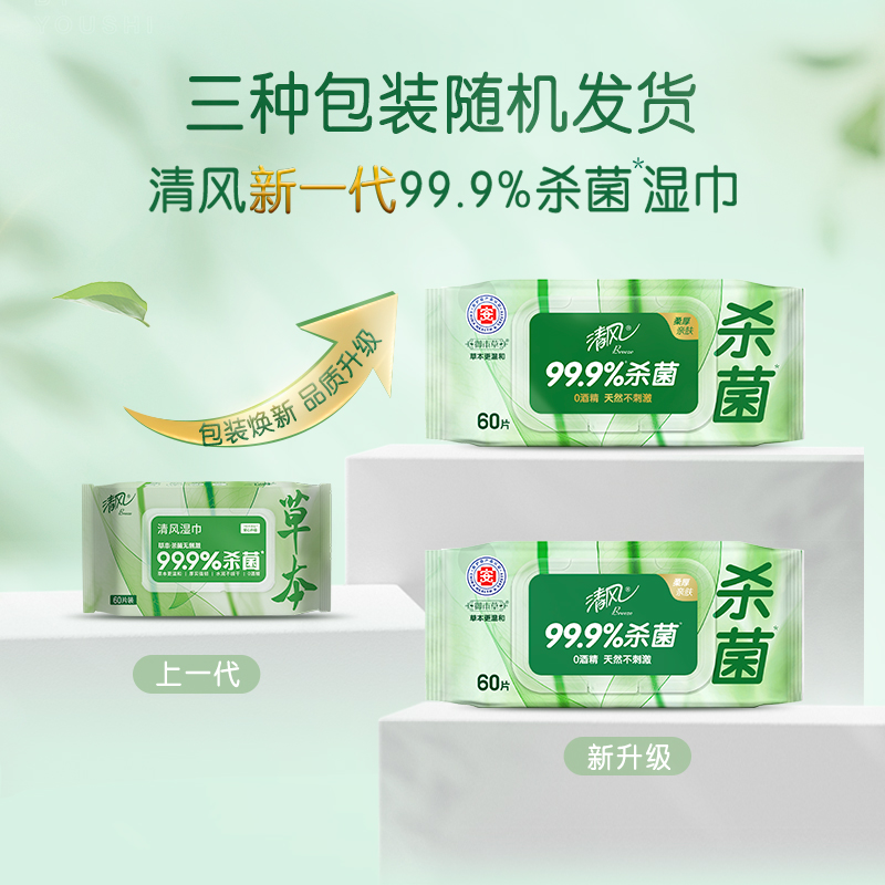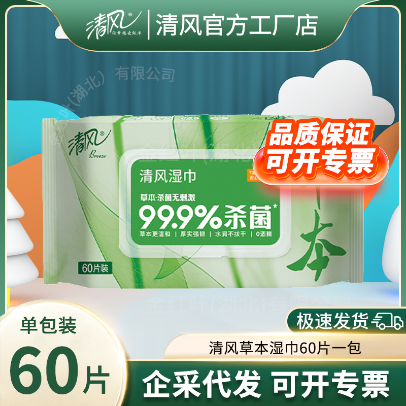 清风御本草湿巾杀菌湿巾纸60片单包家庭实惠装清洁湿纸巾代发批发