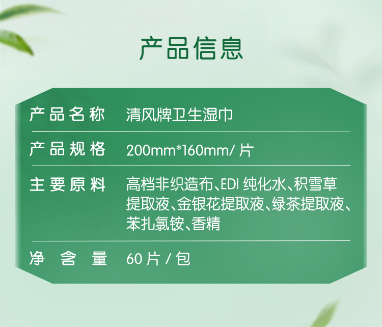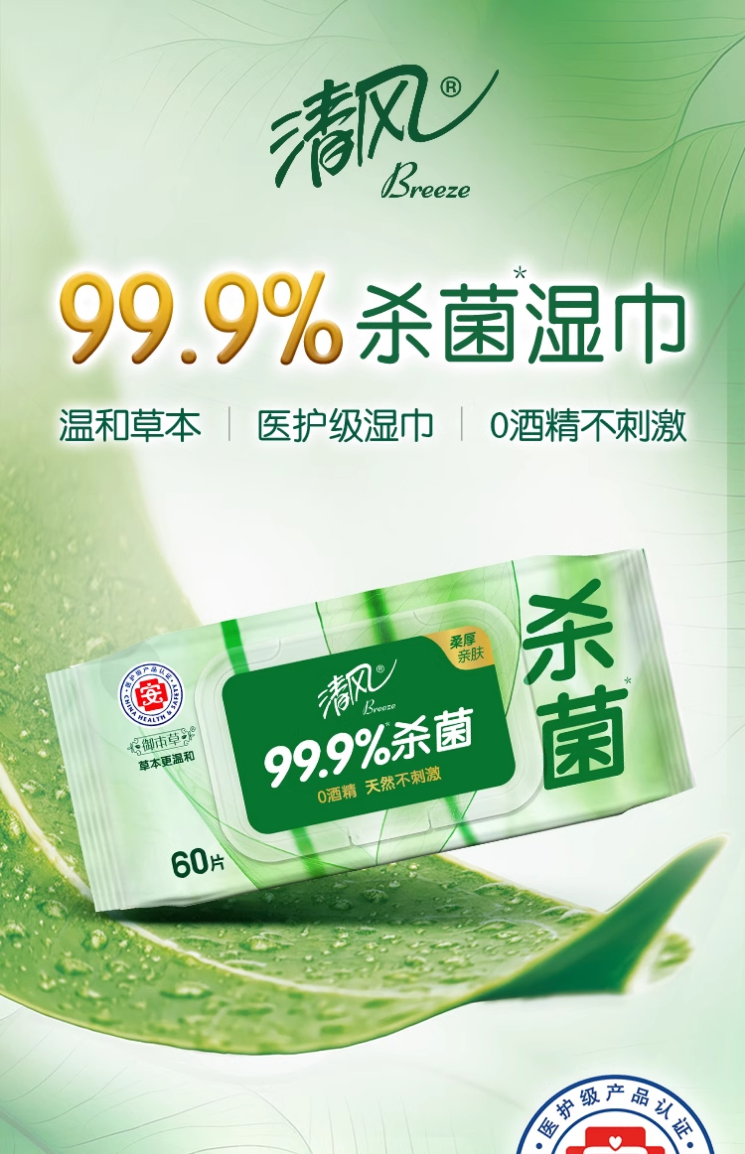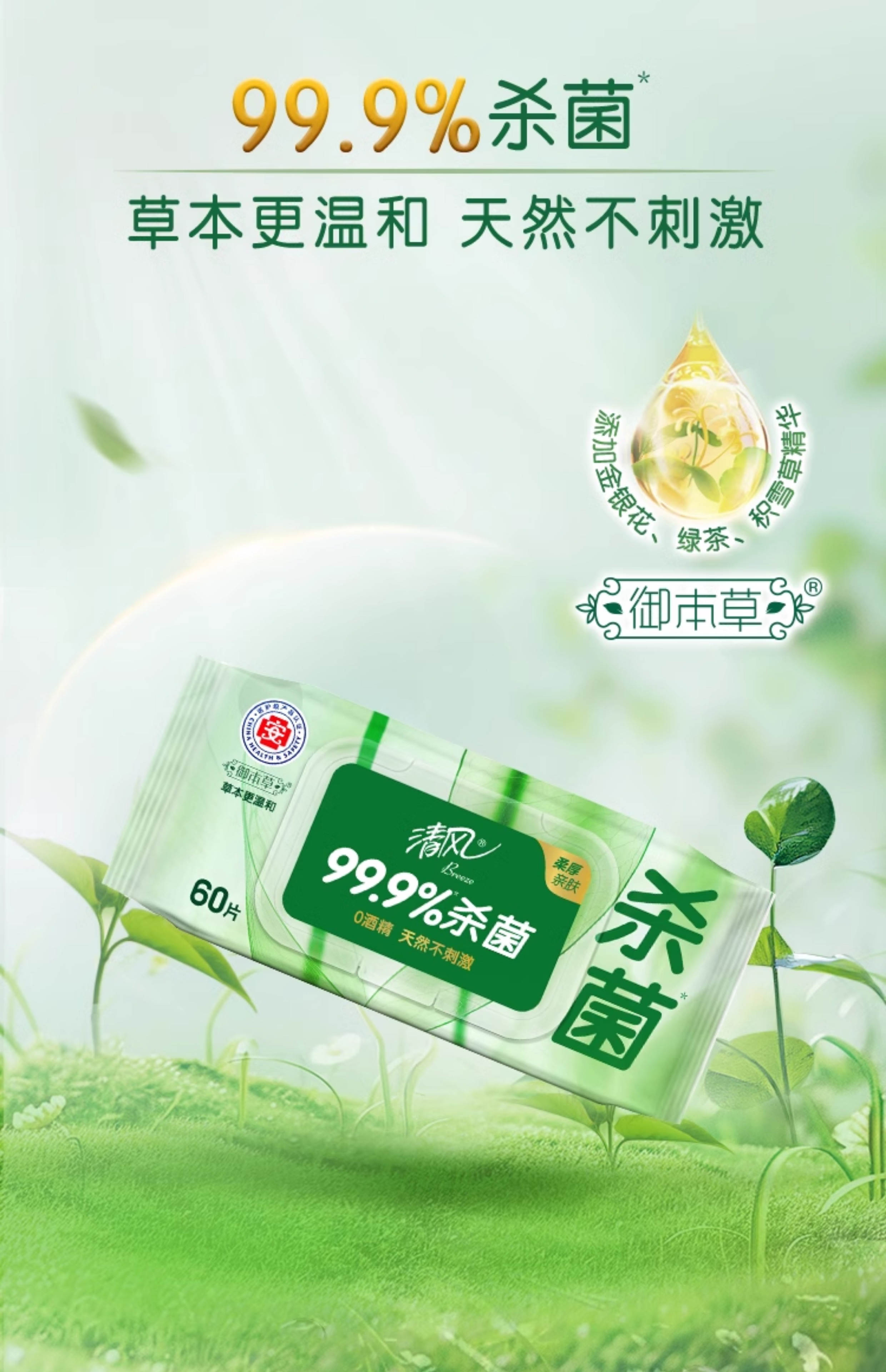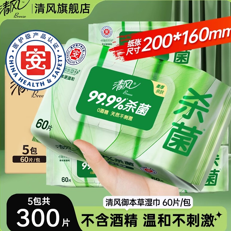 清风御本草杀菌湿巾60片*5包湿纸巾 不含酒精 抽取式