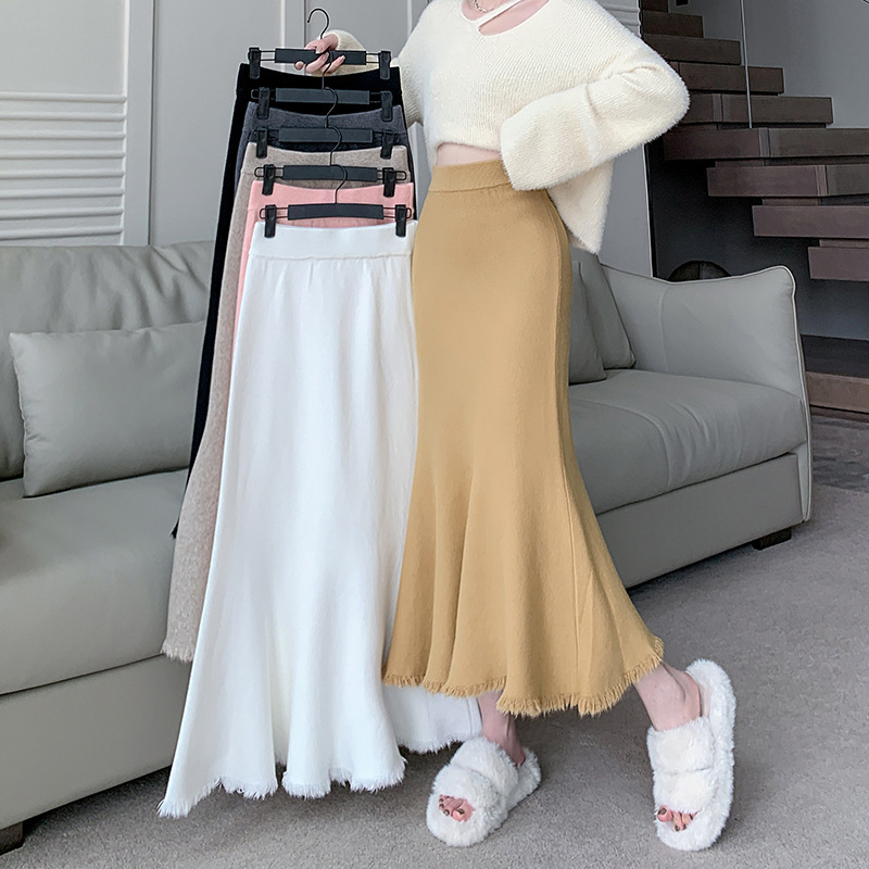 フィッシュテールニットスカートレディース2025春秋冬新作ハイウエストAラインヒップカバードレープロングスタイル