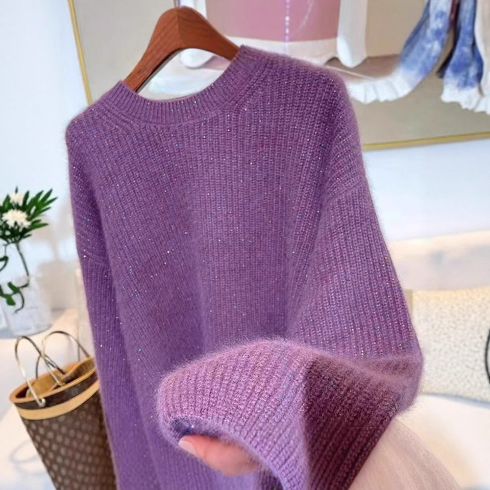 女性用の秋と冬の雰囲気のセーター、ラウンドネックプルオーバーデザイン、ランタンスリーブ、明るいシルクセータートップ