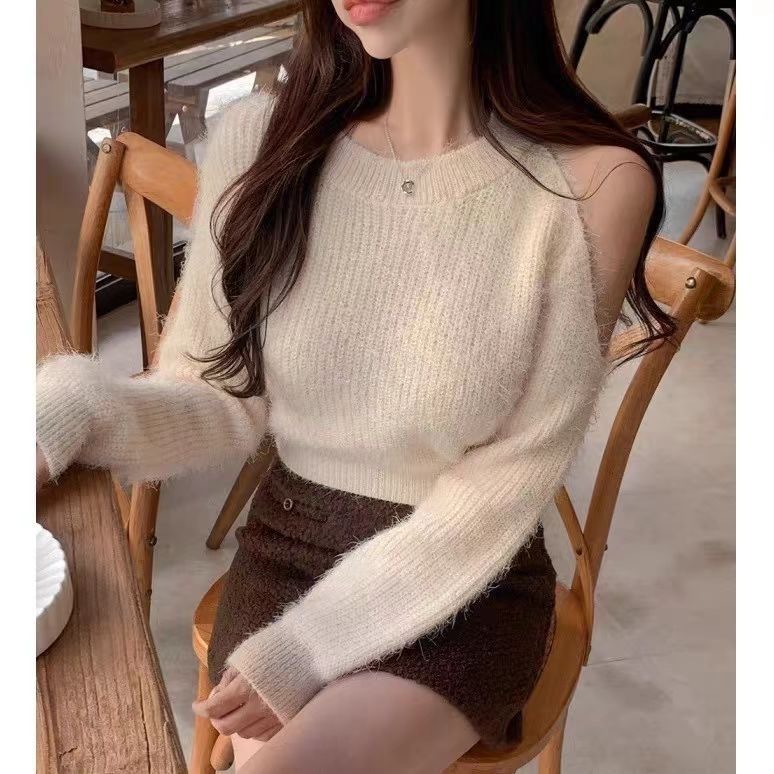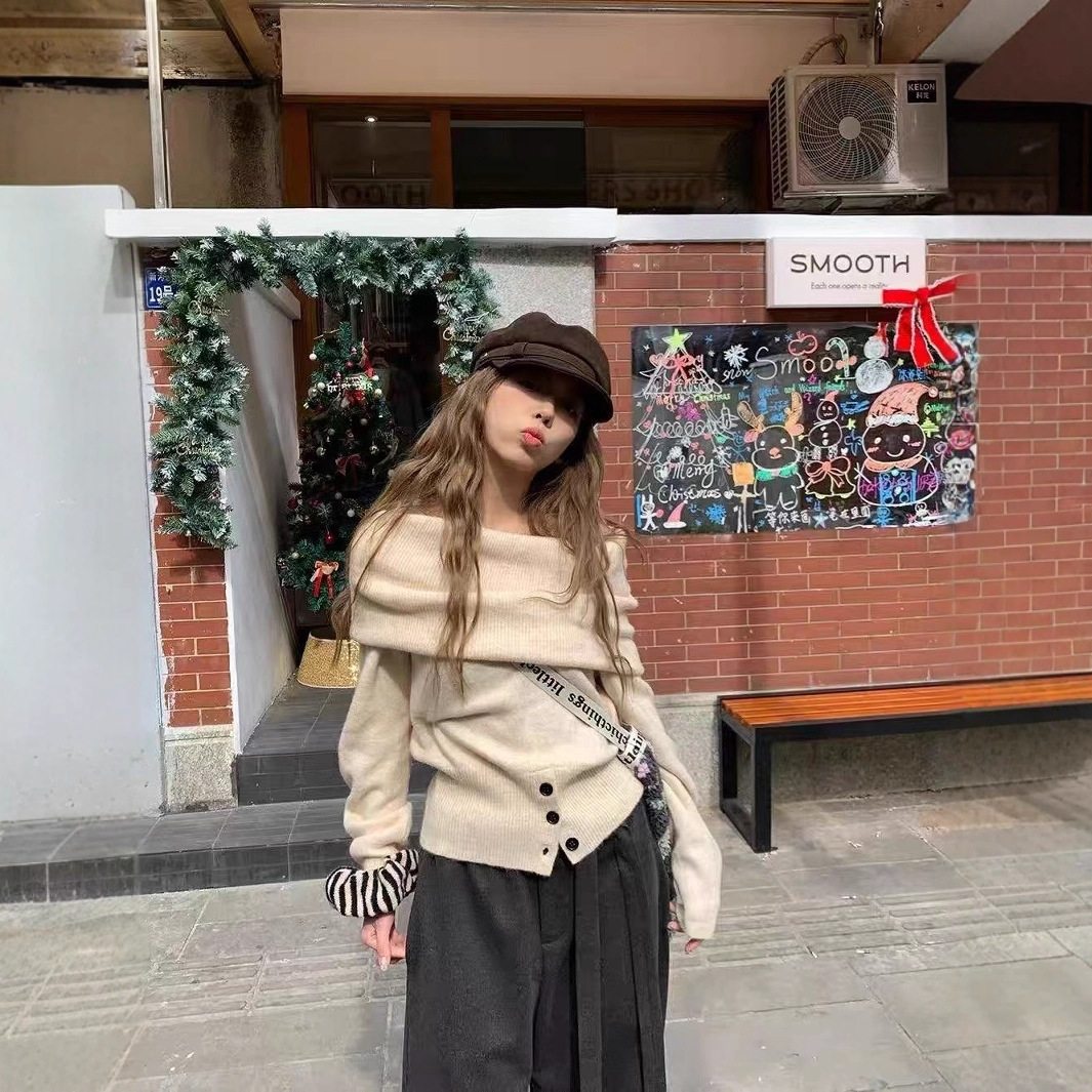 韓国風の優しくてスタイリッシュなワンショルダーセーター2025秋冬新作エレガントでスリムで年齢を軽減する女性用セーター