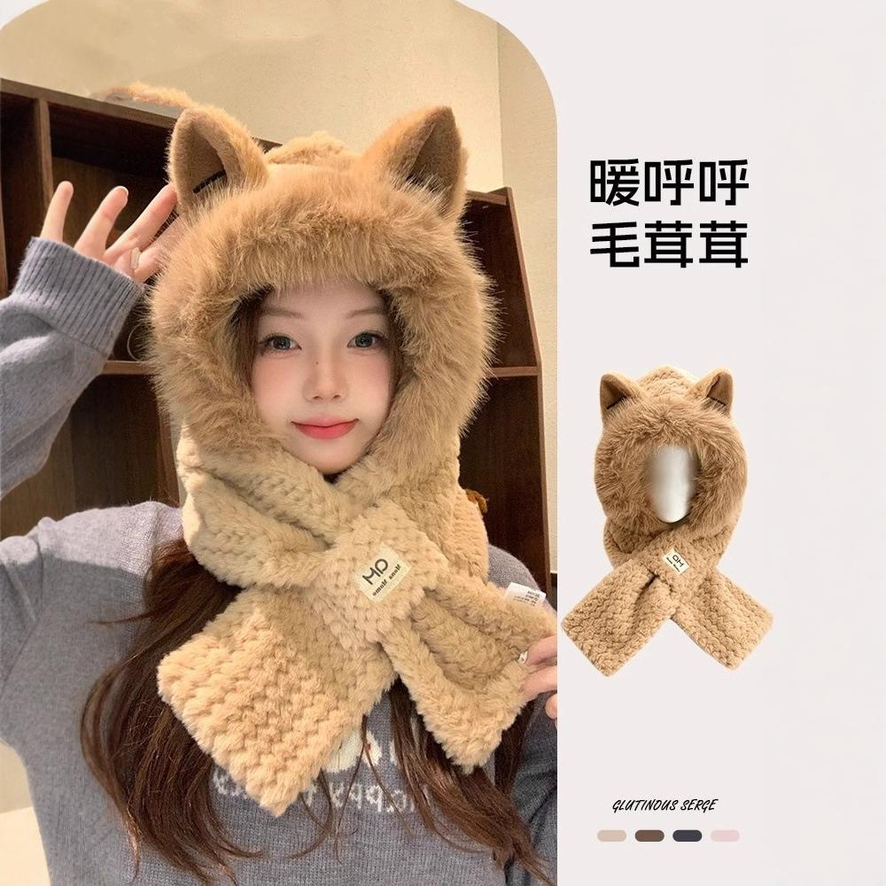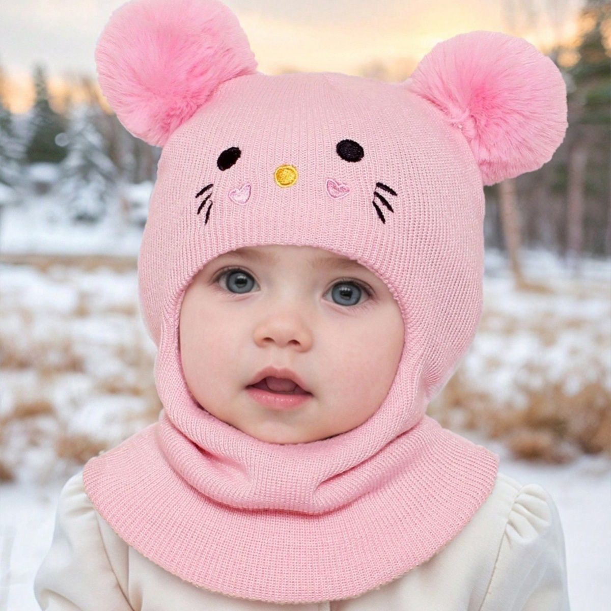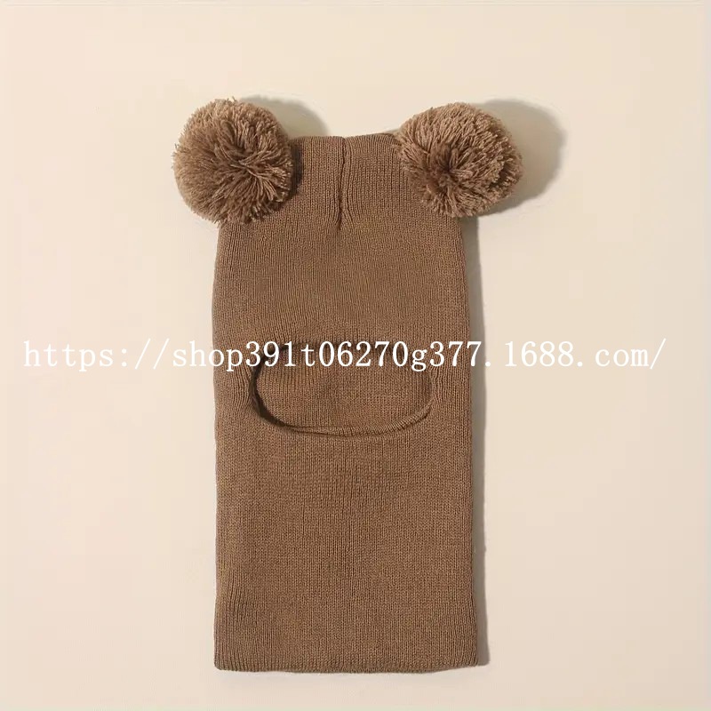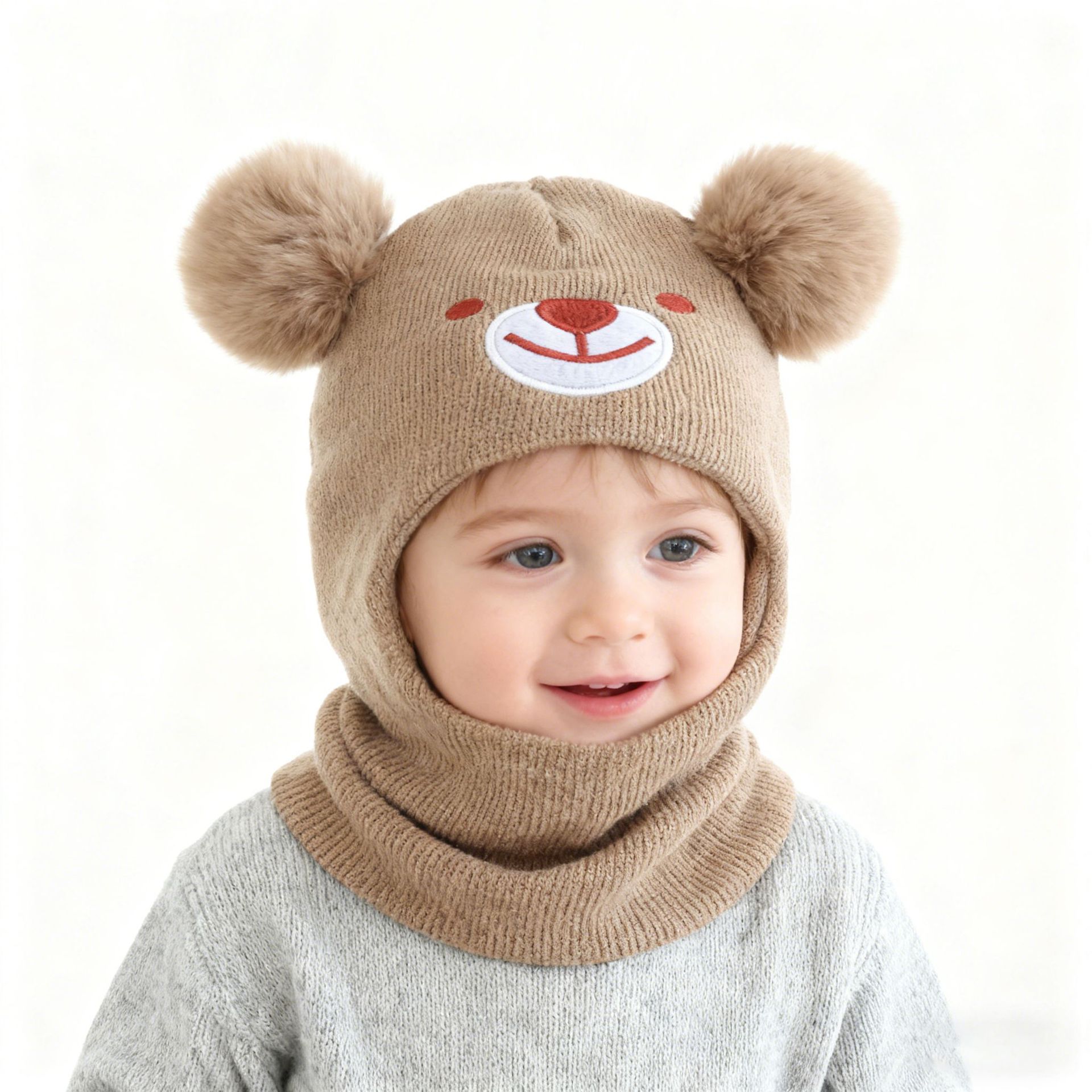 Temu热销冬季儿童帽子围脖一体加绒护耳套头帽宝宝针织小孩连体帽