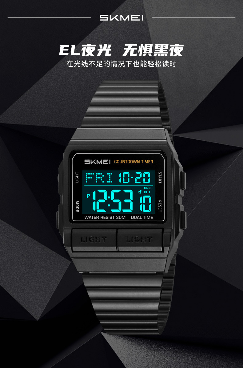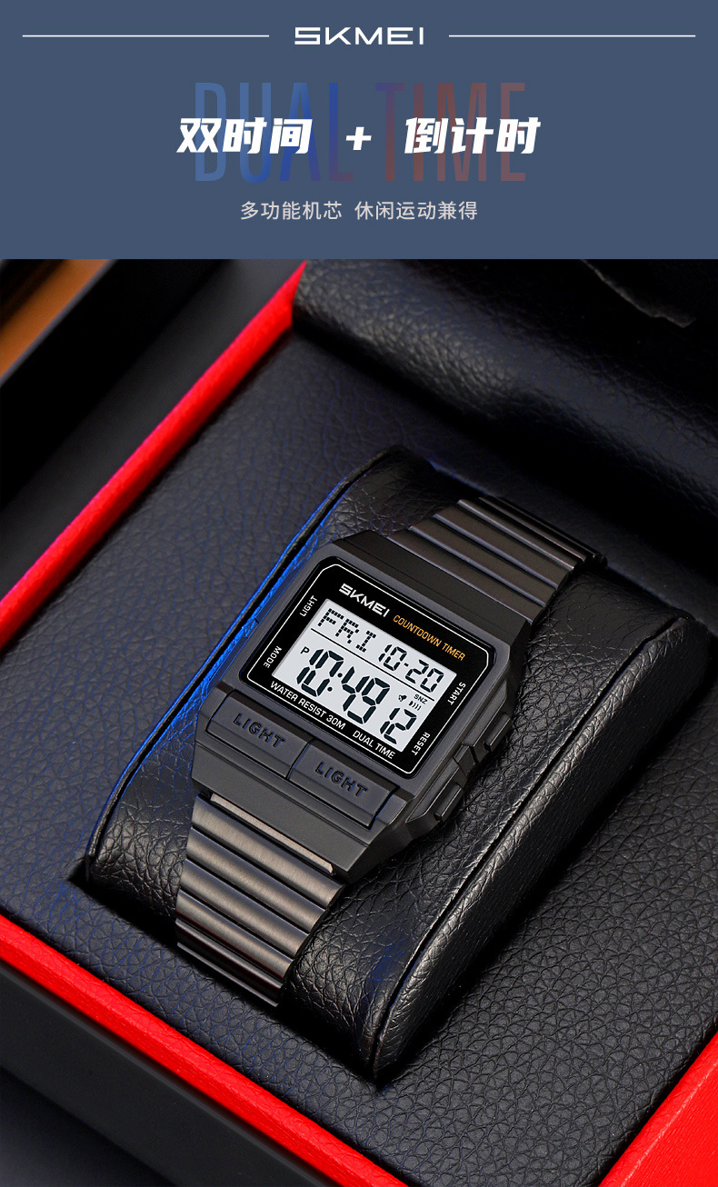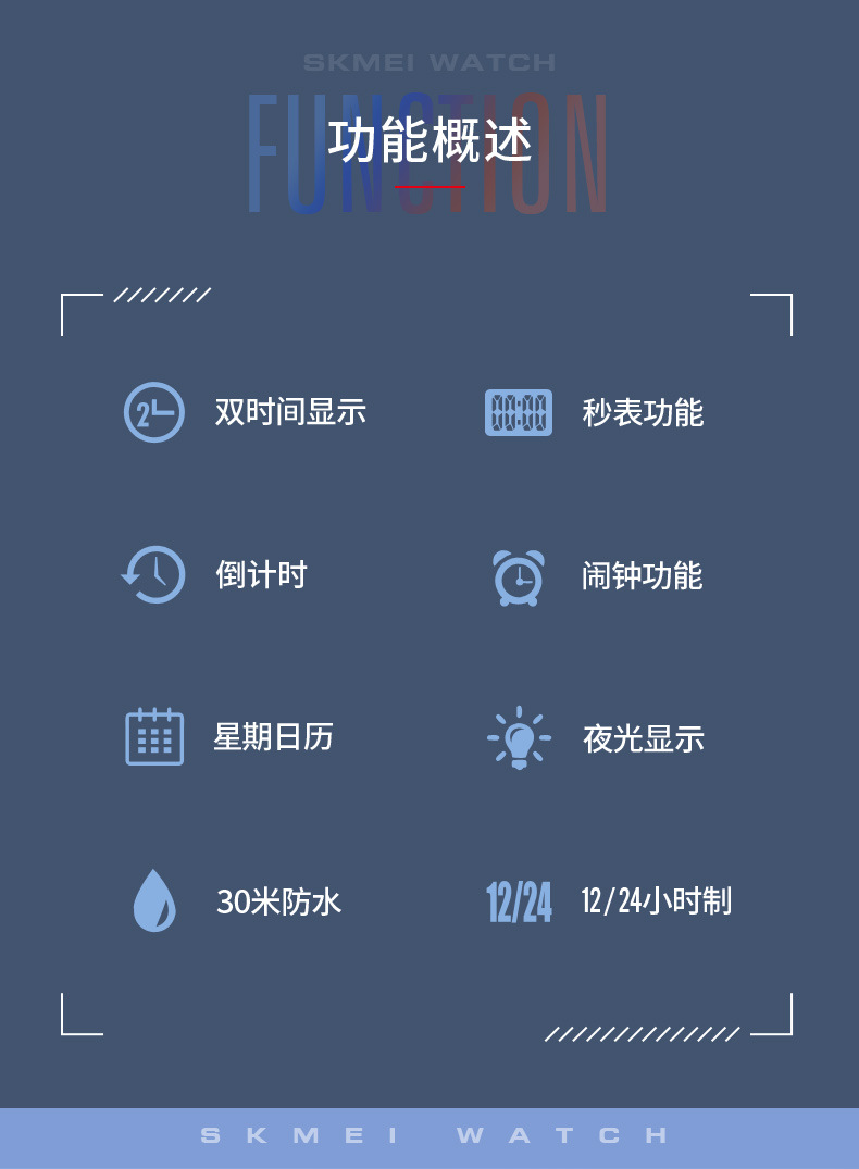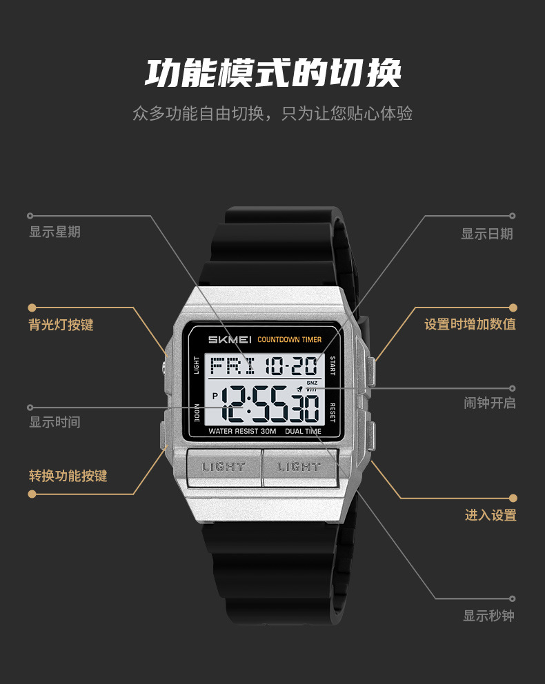 功能:2时间、秒表计时、日期、闹钟、星期、EL夜光、整点报时、12/24小时制、倒计时。