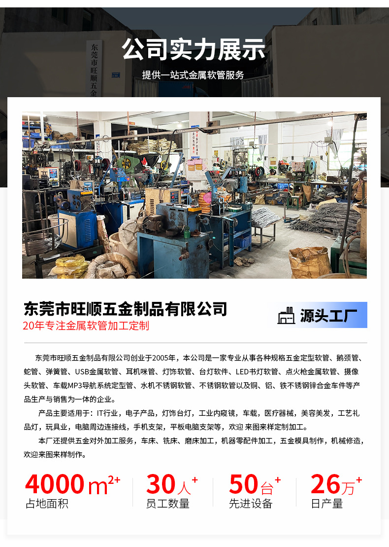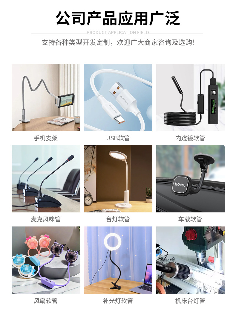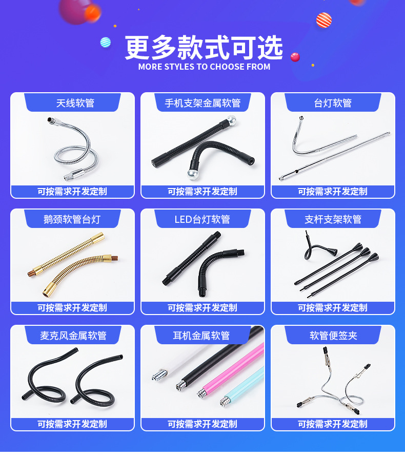メーカーは、夜の光、曲げ可能な成形チューブ、ユニバーサルチューブ、グースネックチューブ、ヘビチューブ、テーブルランプアクセサリー、金属ホースを供給しています。