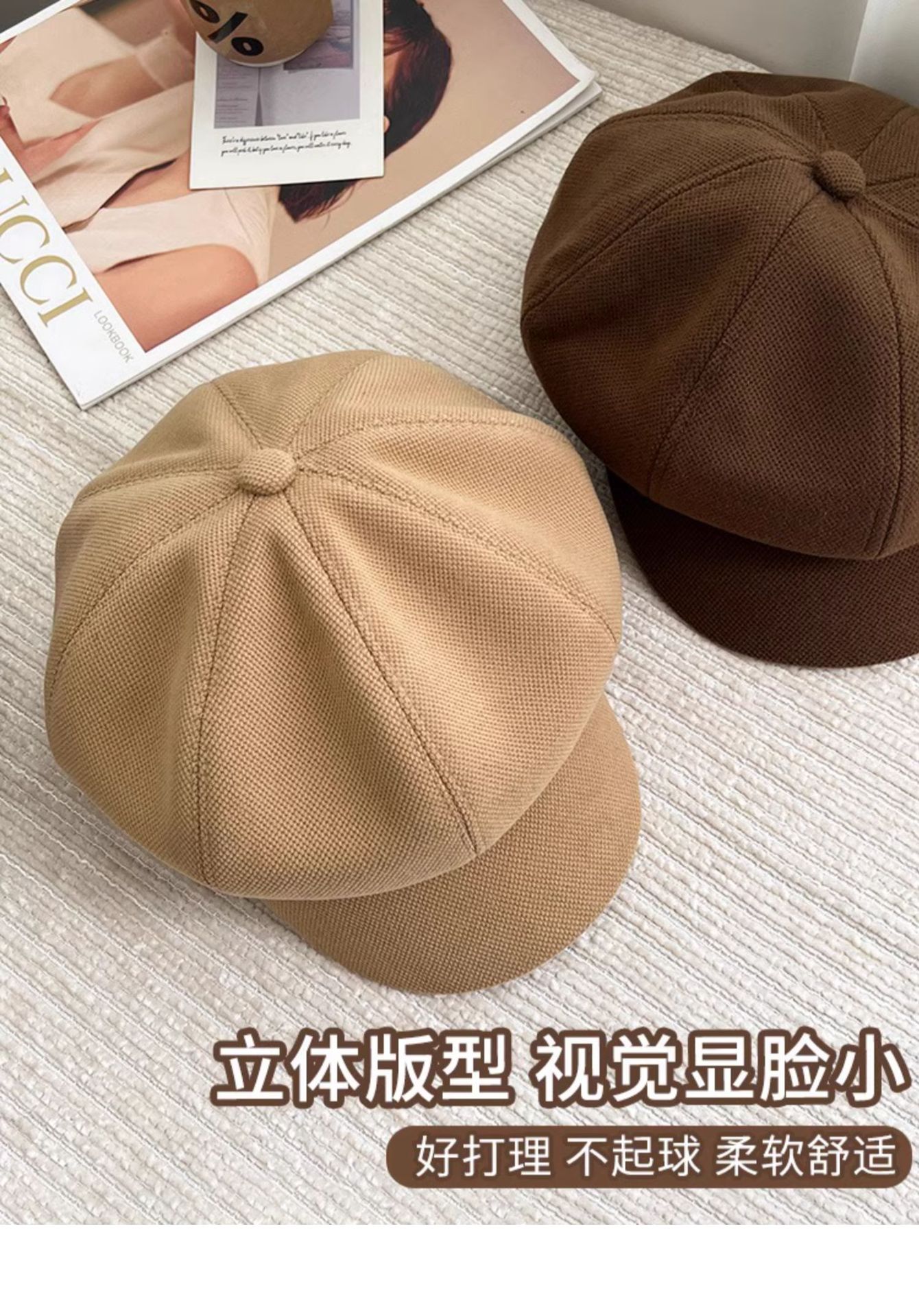 Y美拉德棕色复古贝雷帽女5新秋冬显脸小八角帽子大头围报童帽