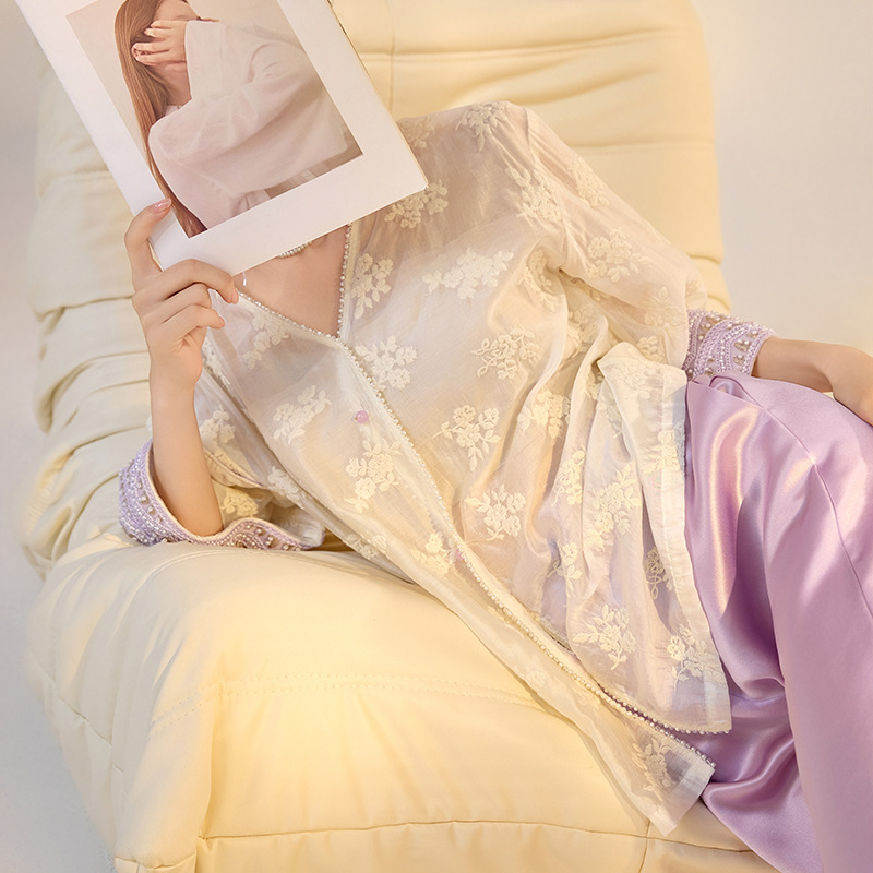 2025年秋新作 中華風 花柄刺繍 スパンコールシャツ オールドマネースタイル エレガント サテンブラウス M3003