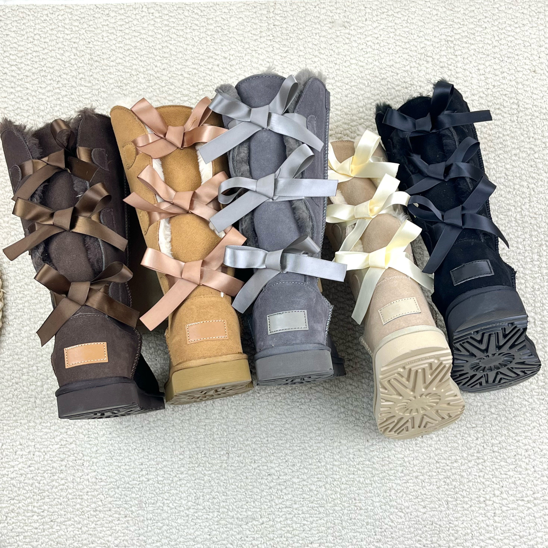 跨境外贸大码蝴蝶结高筒雪地靴真皮高筒雪地靴加绒加丝带厚冬季女