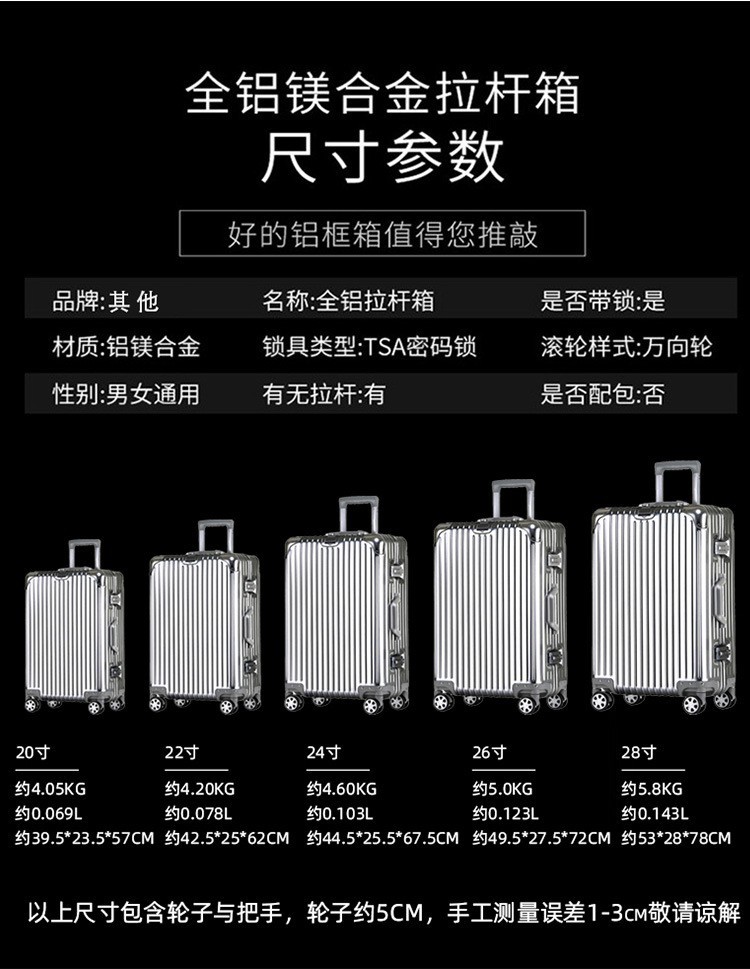 新款大容量铝镁合金行李箱加厚板材旅行箱万向轮拉杆箱20寸登机箱