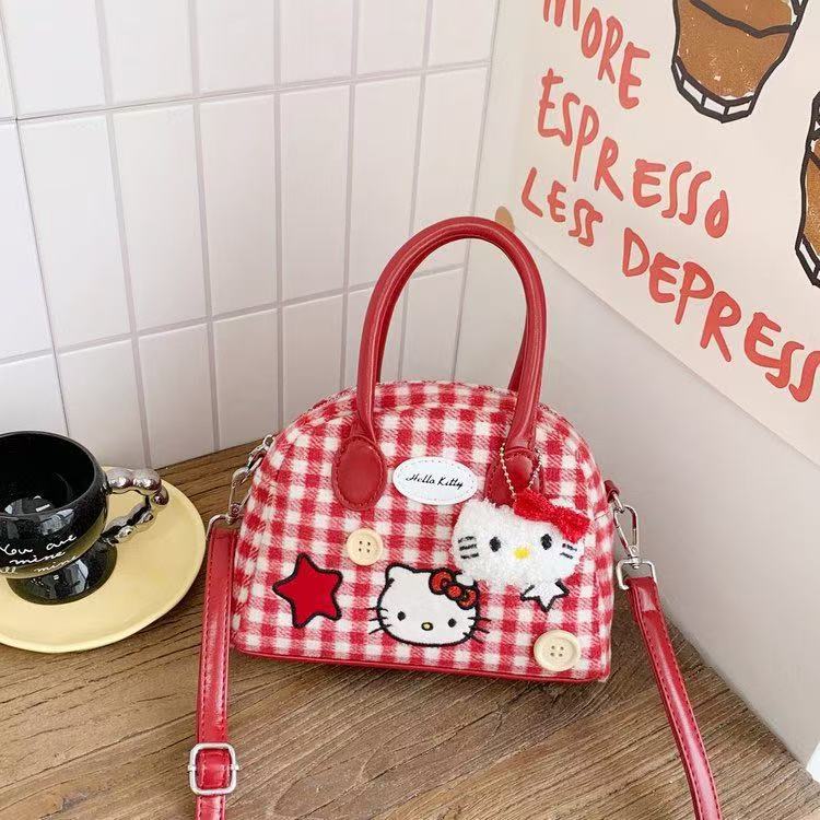 韩版ins卡通可爱kt猫单肩斜挎包包女小众设计百搭红格子手提背包
