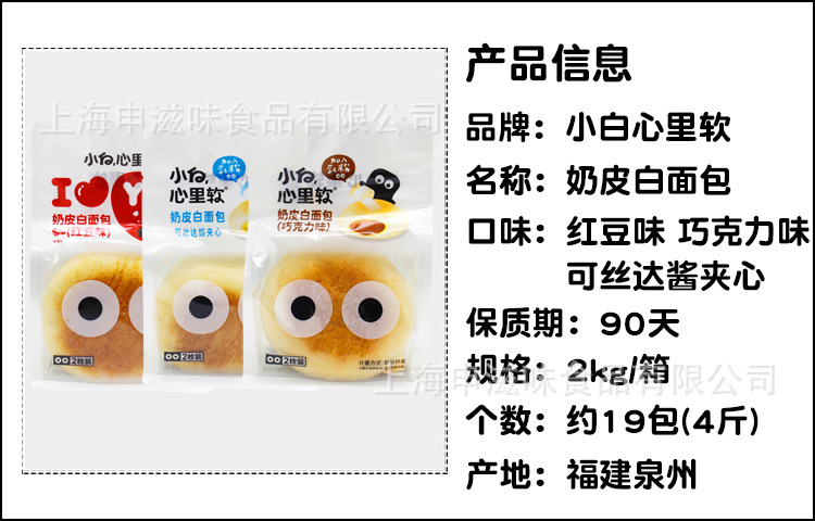 包装规格 小白心里软【奶皮白面包】原味2kg/箱,小白心里软【奶皮白面包】红豆味2kg/箱,小白心里软【奶皮白面包】巧克力味2kg/箱